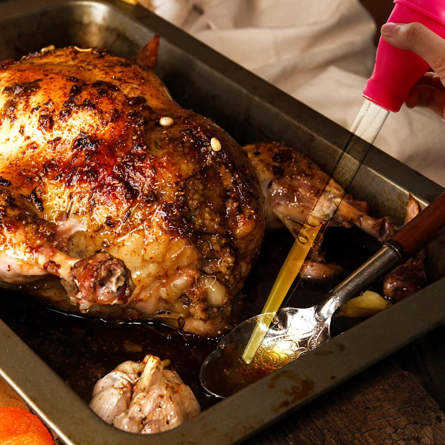 - Using introduction: it is easy for you to squeeze the top and use the suction to absorb the juices as needed to pour over the turkey, ham, or other dishes