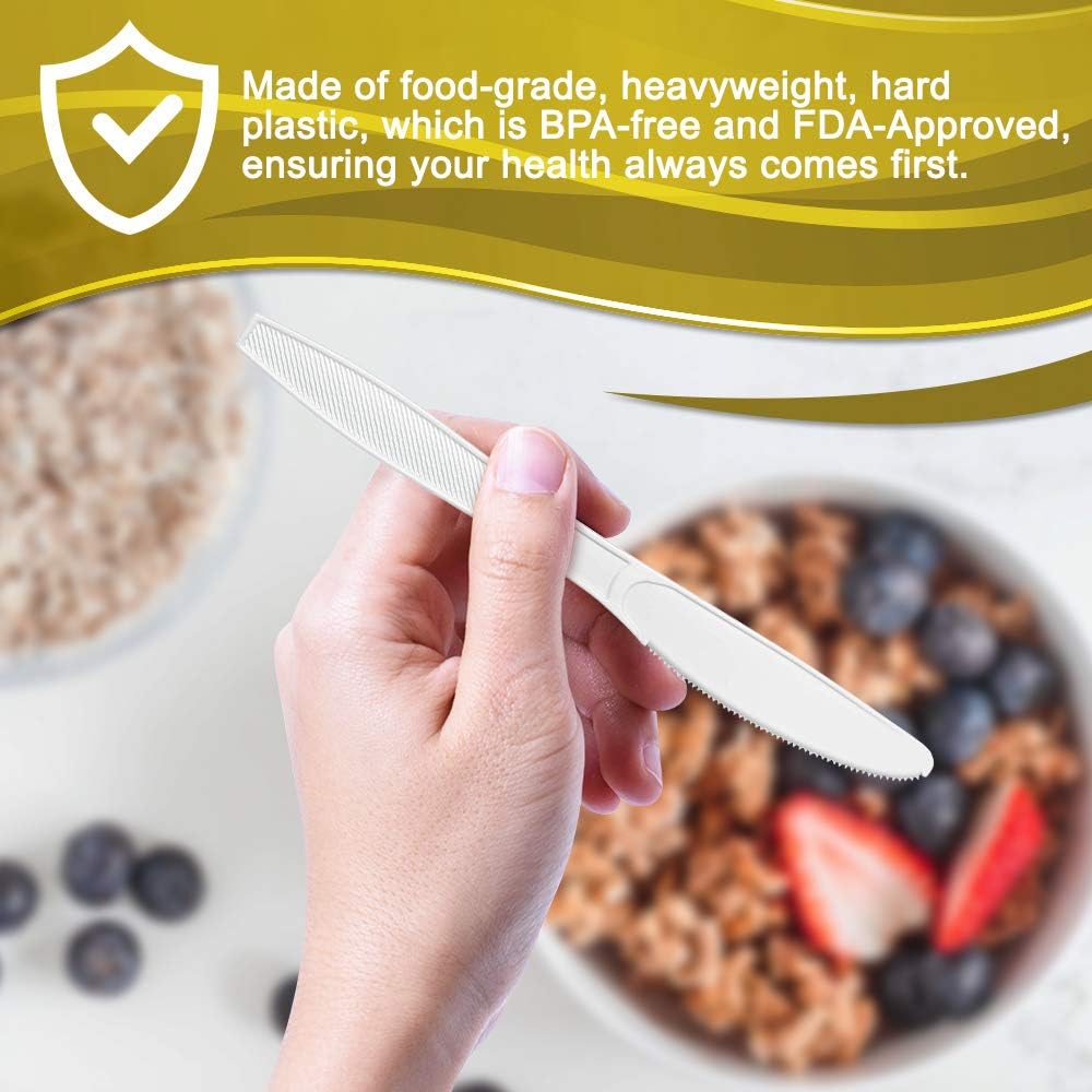 - EXTRA HEAVY WEIGHT CONSTRUCTION: Heavy duty, disposable, plastic knives. The heavyweight plastic construction is made of food-grade plastic that is very sturdy, and ideal for solid foods like steaks, salads, fish, corn and more.
