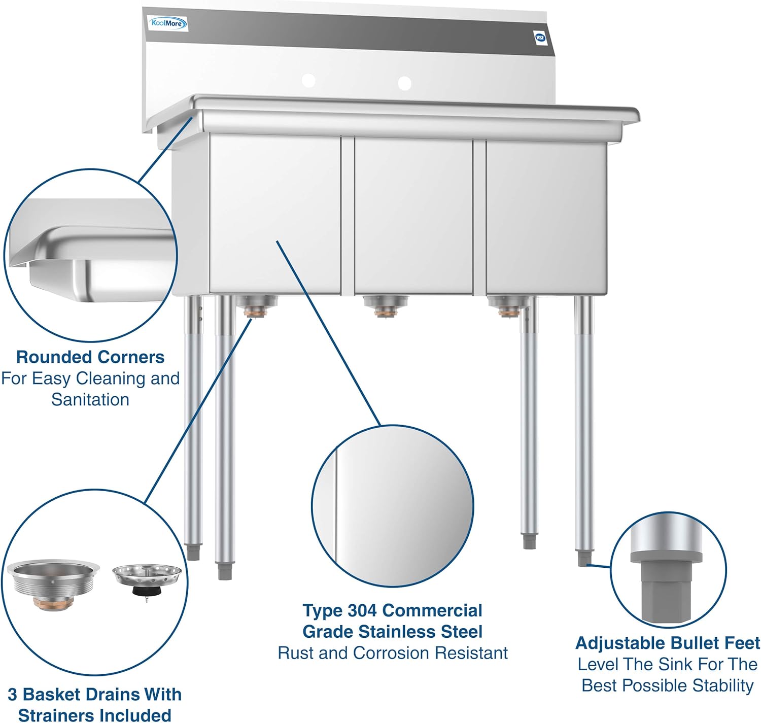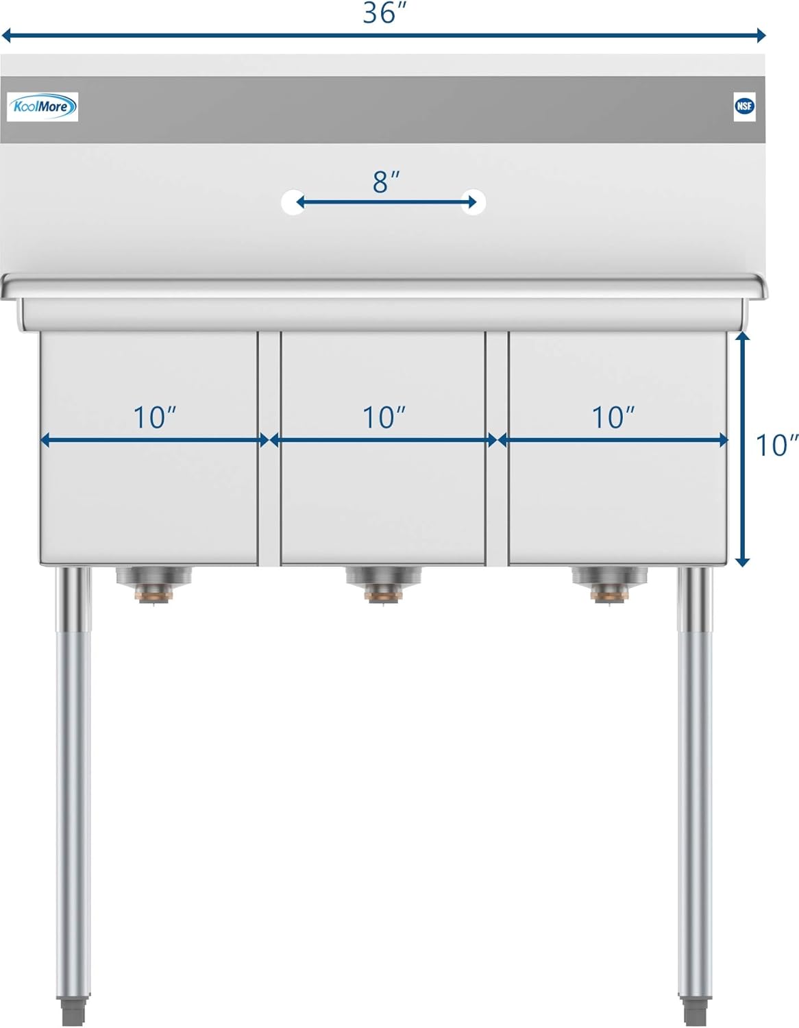 KoolMore 36" 3 Compartment Stainless Steel Triple Bowl NSF Commercial Kitchen Sink - Bowl Size 10" x 14" x 10"
