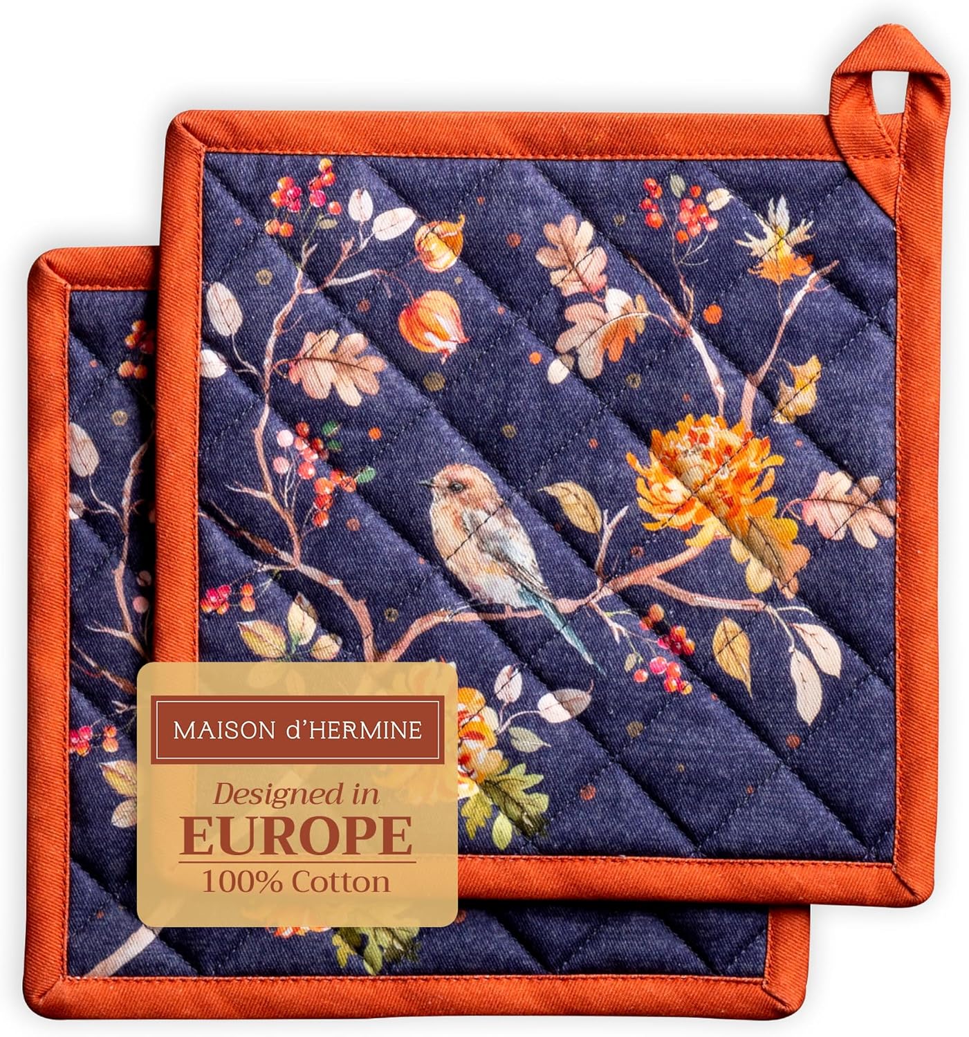 - Package includes: 2 pot holders measures 8"x8". Ideal as a hot pad for dishes, coffee pots, cast iron pans, or cookware. Designed in Europe and Made in India, it blends style, function, and comfort into a daily kitchen essential