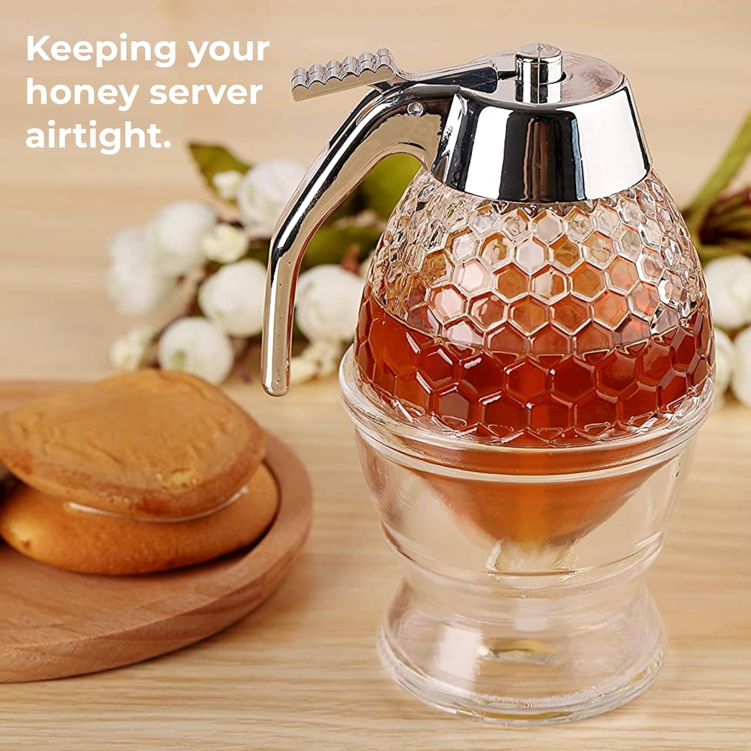 - No More Sticky Spills: Enjoy clean pouring with this no drip honey dispenser; the included stand keeps surfaces tidy while the glass honey jar gives you full control for tea pancakes and baked treats