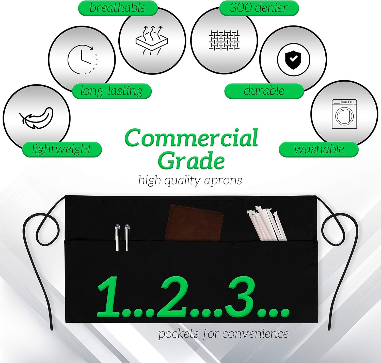 GREEN LIFESTYLE Server Aprons with 3 Pockets - Waist Apron, Waitress Apron for Women and Man, Water Resistant with Long Waist Strap Reinforced Seams, Half Apron (12 Pack - Black)