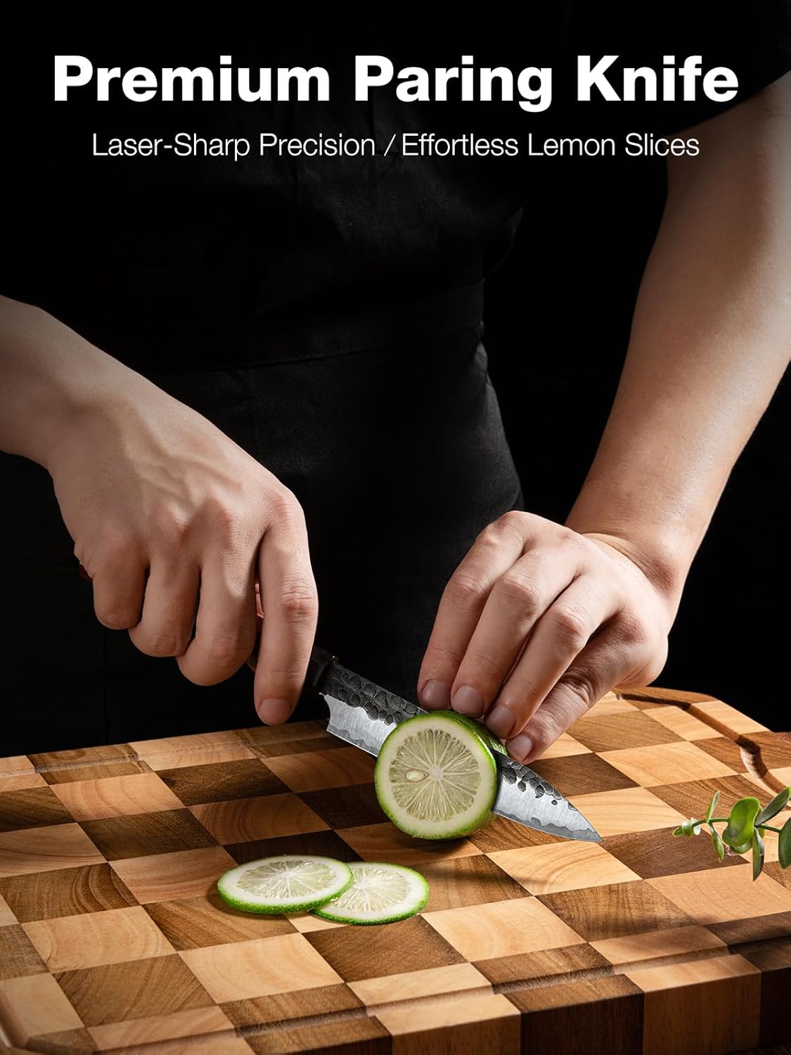 - Japanese-Crafted Precision Edge – Forged from premium 9CR18MOV Japanese steel (HRC 58-62), this paring knife combines razor-sharp durability with effortless food release. Perfect for slicing fruits, dicing vegetables, and filleting meats, its dimpled blade ensures precision while resisting corrosion – ideal for daily culinary challenges.