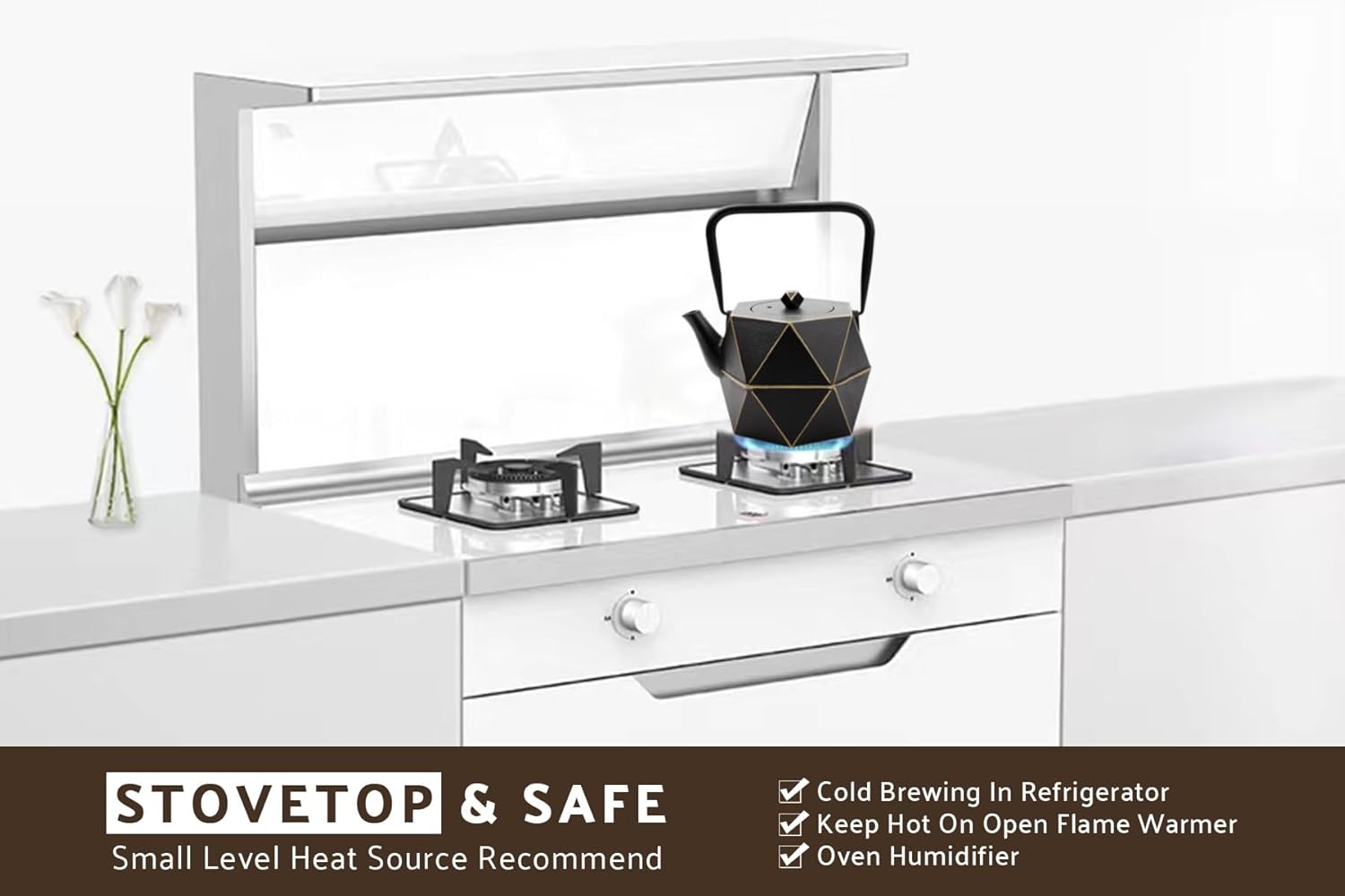 - 💎 Unique Design Tea Kettle - Diamond-shaped Iron teapot, Combine both modern and vintage style. The stainless-steel removable infuser is perfect for loose-leaf tea, teabags, and blooming tea. If you might want a sturdy and heavy-duty teapot, this is just for you. An ergonomic fold-down handle and a shortly curved spout allow easy grip and easy pouring after boiling on the stove top. TO CLEAN TEA POT - Simply clean it with clean water.