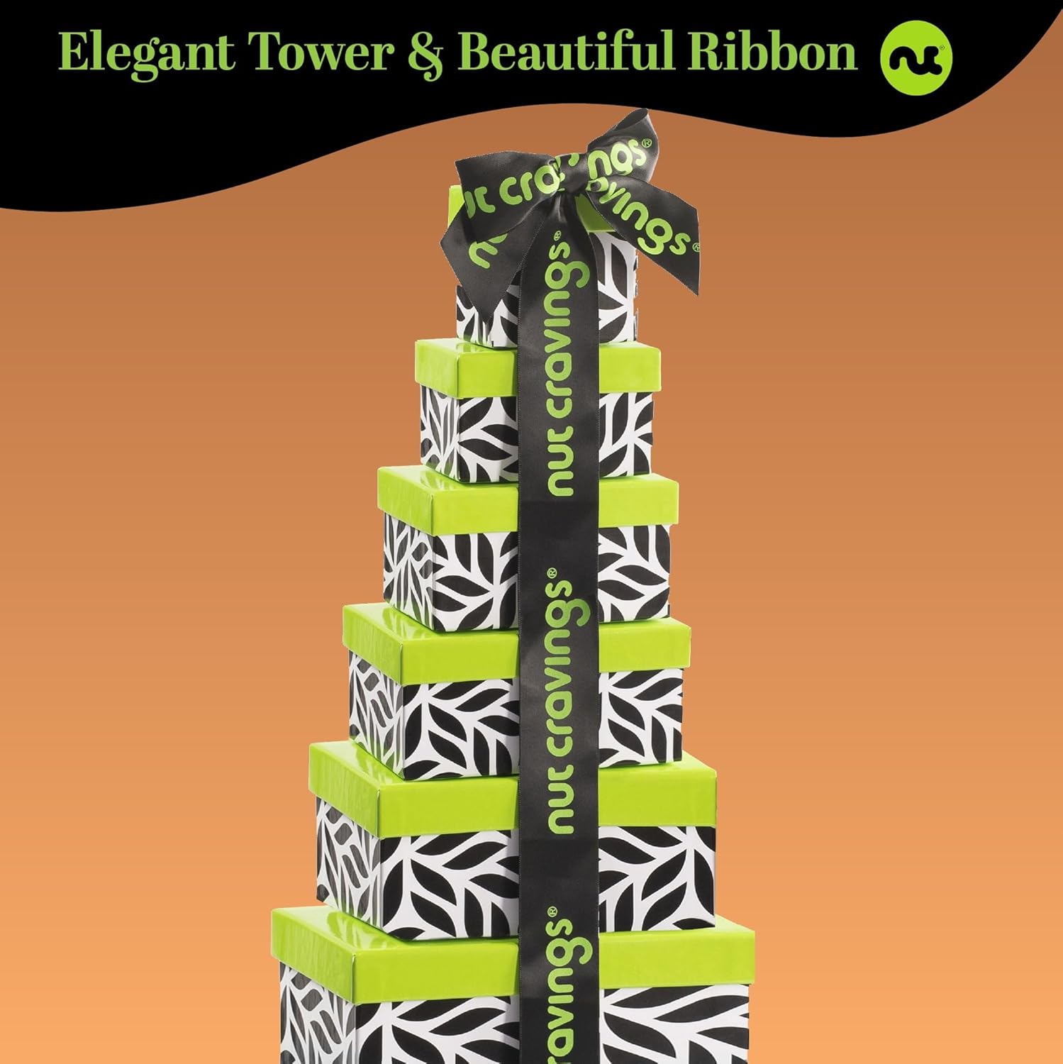 NUT CRAVINGS - Dried Fruit & Mixed Nuts Gift Basket Leaf Tower + Ribbon (12 Assortments) Food Arrangement, Healthy Snack Care Package, Food Assortments