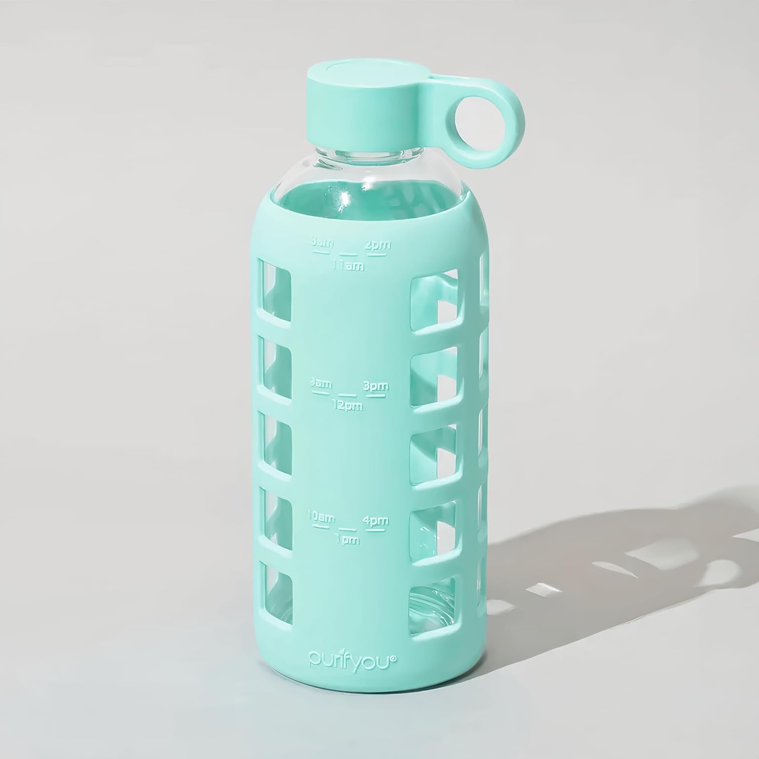 purifyou 40oz / 32oz / 22oz / 12oz Borosilicate Glass Water Bottle with Time & Volume Markers, Silicone Sleeve, Stainless Steel Lid – Reusable Glass Bottle for Water & Juice (22oz Glow-in-the-Dark)