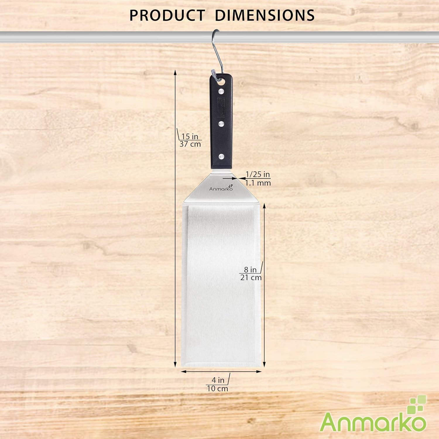 - Firm grip - ergonomic and comfortable ABS plastic handle securely attached with triple rivets. Hook and hole for easy hanging. Flat spatula and stainless steel turner are very well balanced . Metal spatula is dishwasher safe .