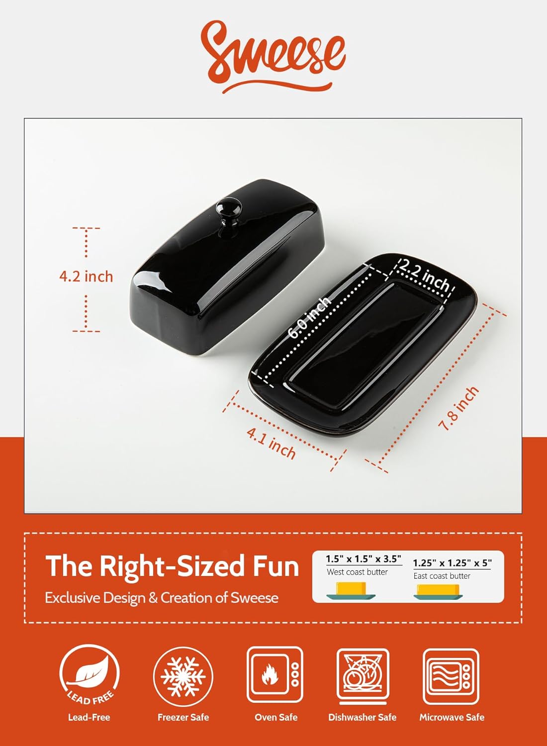 - Elegant & Minimalist Style - The Sweese butter dish is clean, pure, and has a smooth and shiny appearance, which complements the kitchen. The elegant and simple curved design makes the butter keeper look very high-end and fits perfectly with any decoration style. Butter dishes are available in various colors and can be easily combined with other cookware to create a rich and harmonious color ambiance.