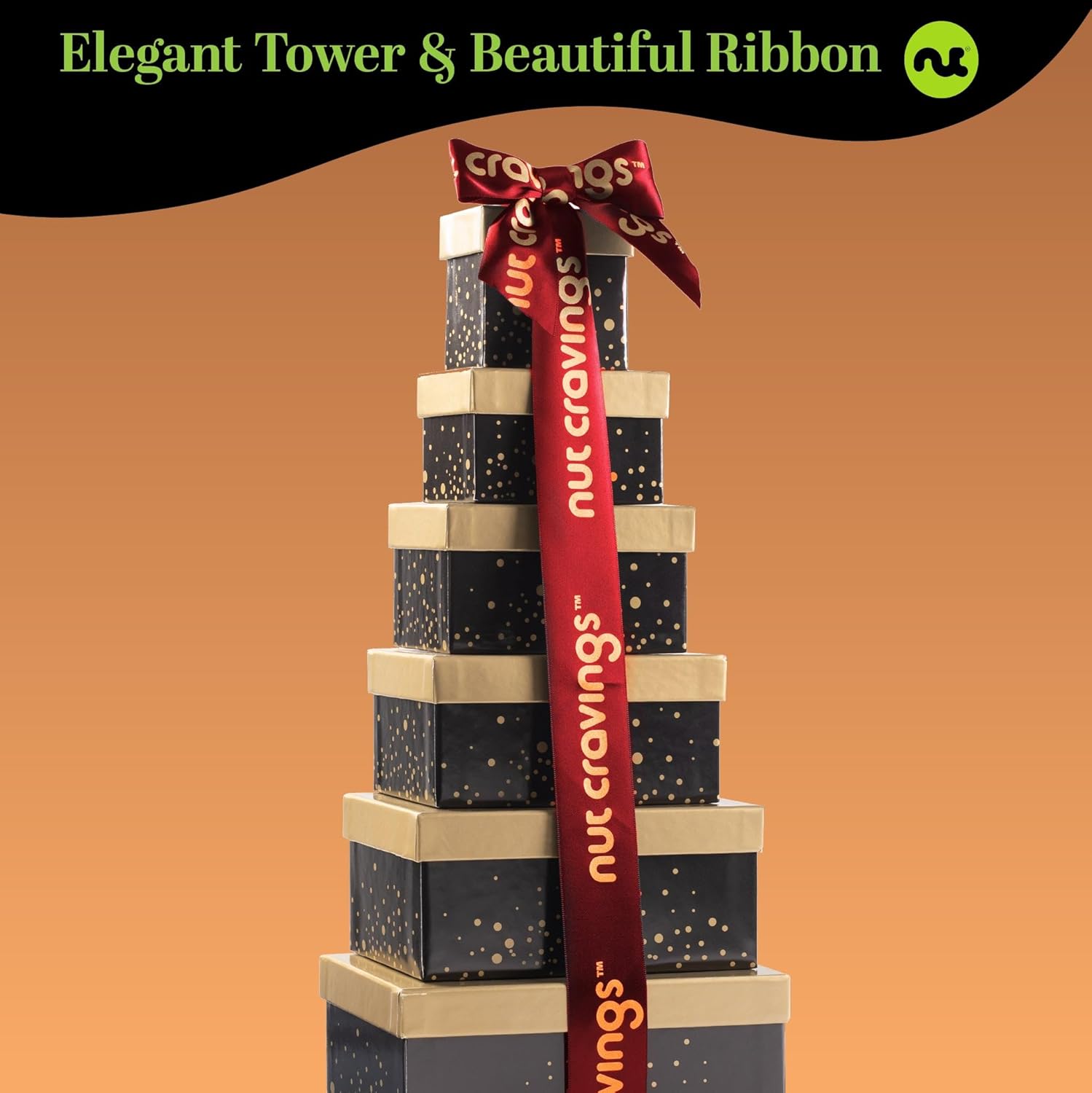 NUT CRAVINGS - Mixed Nuts Gift Basket Black Tower + Heart Ribbon (12 Assortments) Food Arrangement, Healthy Snack Care Package, Food Assortments