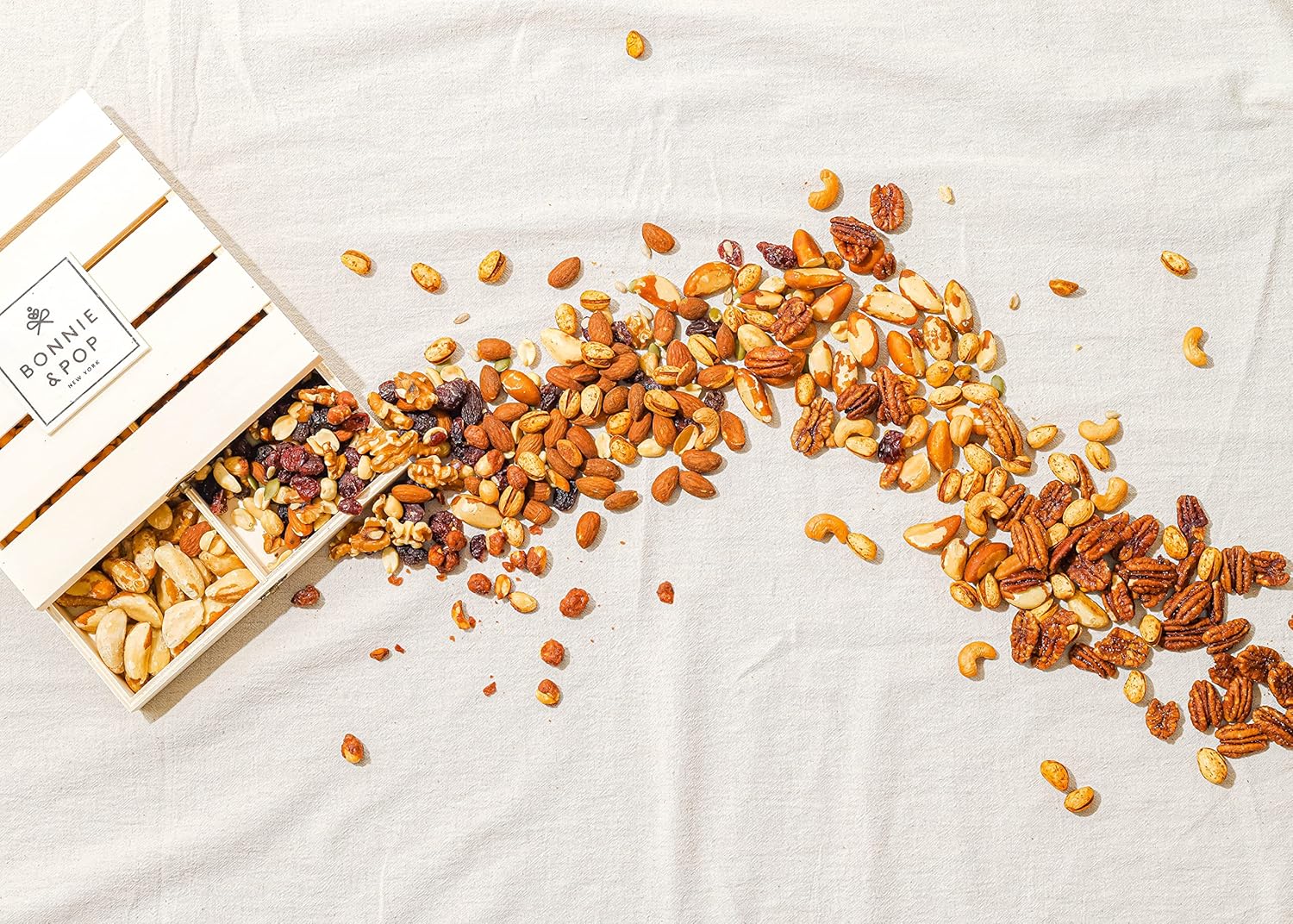 Nut Gift Basket, in Reusable Wooden Crate, Healthy Gift Option, Gourmet Snack Food Box, with Unique Flavors, Great for Feel Better, Sympathy & Birthday- Bonnie & Pop