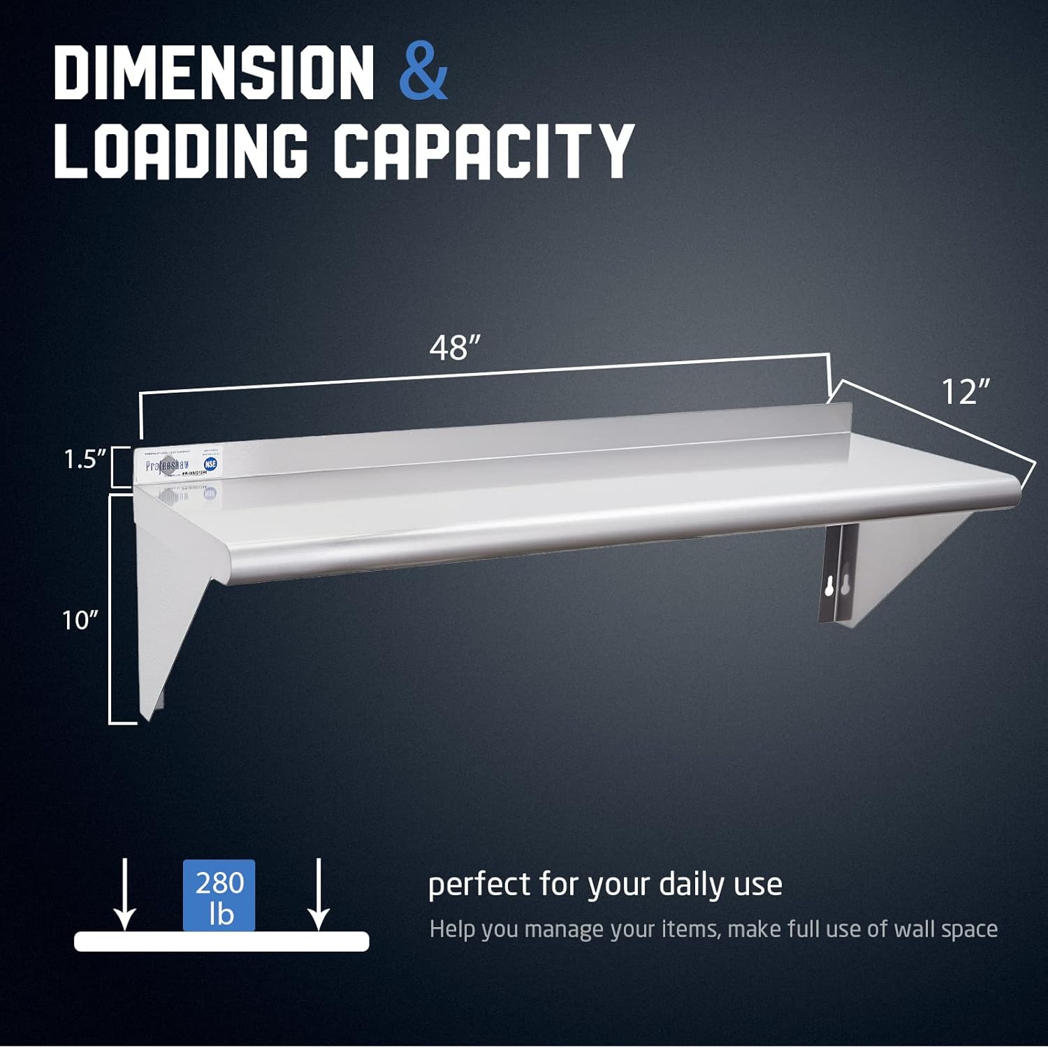 Profeeshaw NSF Stainless Steel Shelf 12” x 48”, 280 lb Commercial Shelves Wall Mounted Metal Shelving with Backsplash and 2 Brackets for Restaurant, Bar, Utility Room, Kitchen and Garage
