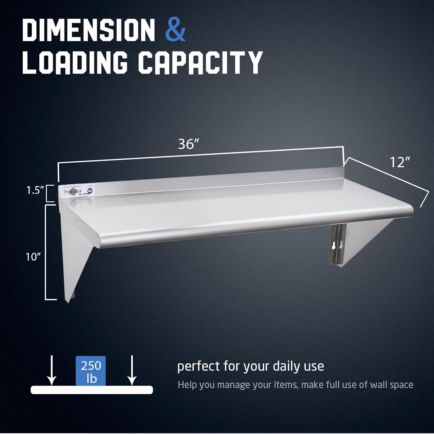 Profeeshaw NSF Stainless Steel Shelf 12” x 36”, 250 lb Commercial Shelves Wall Mounted Metal Shelving with Backsplash and 2 Brackets for Restaurant, Bar, Utility Room, Kitchen and Garage