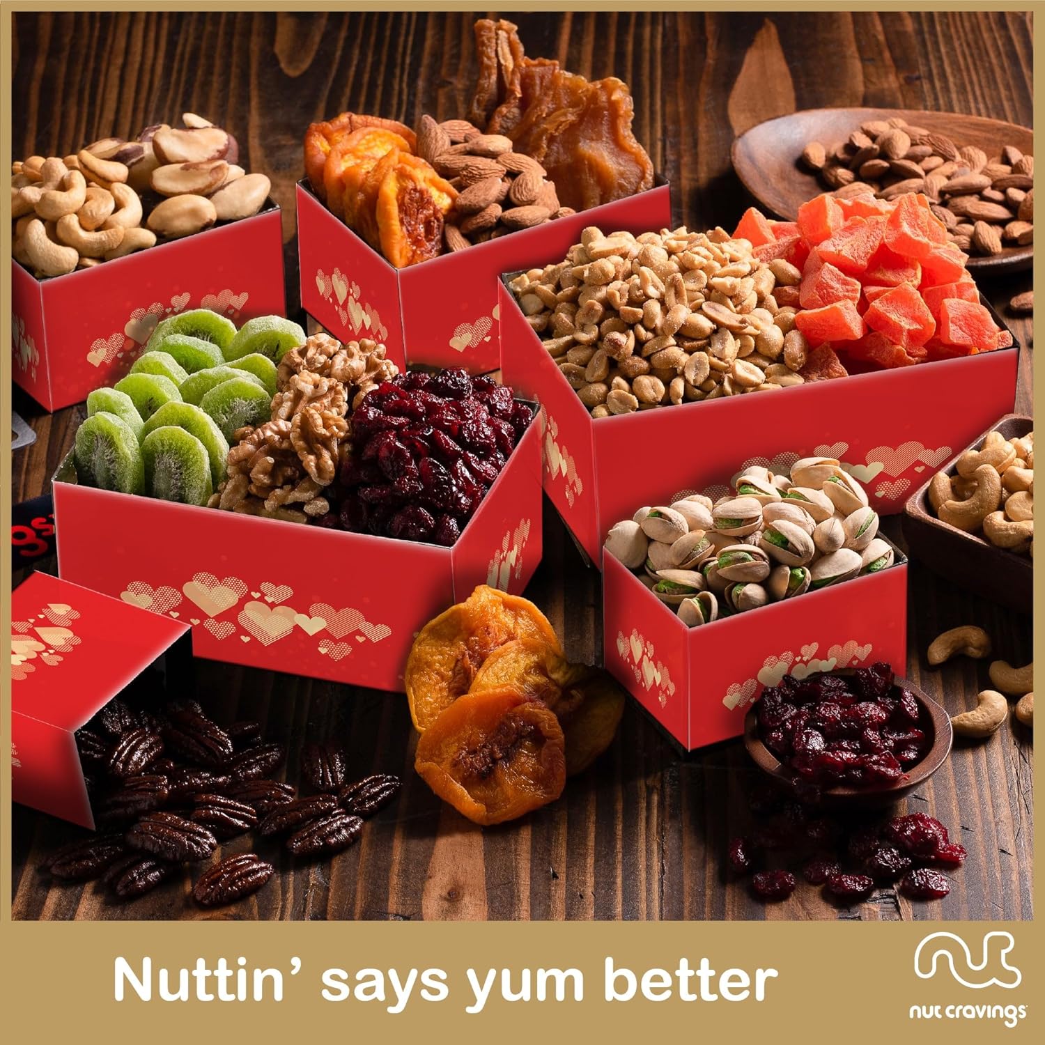 NUT CRAVINGS - Dried Fruit & Mixed Nuts Gift Basket Red Tower + Heart Ribbon (12 Assortments) Food Arrangement, Healthy Snack Care Package, Food Assortments