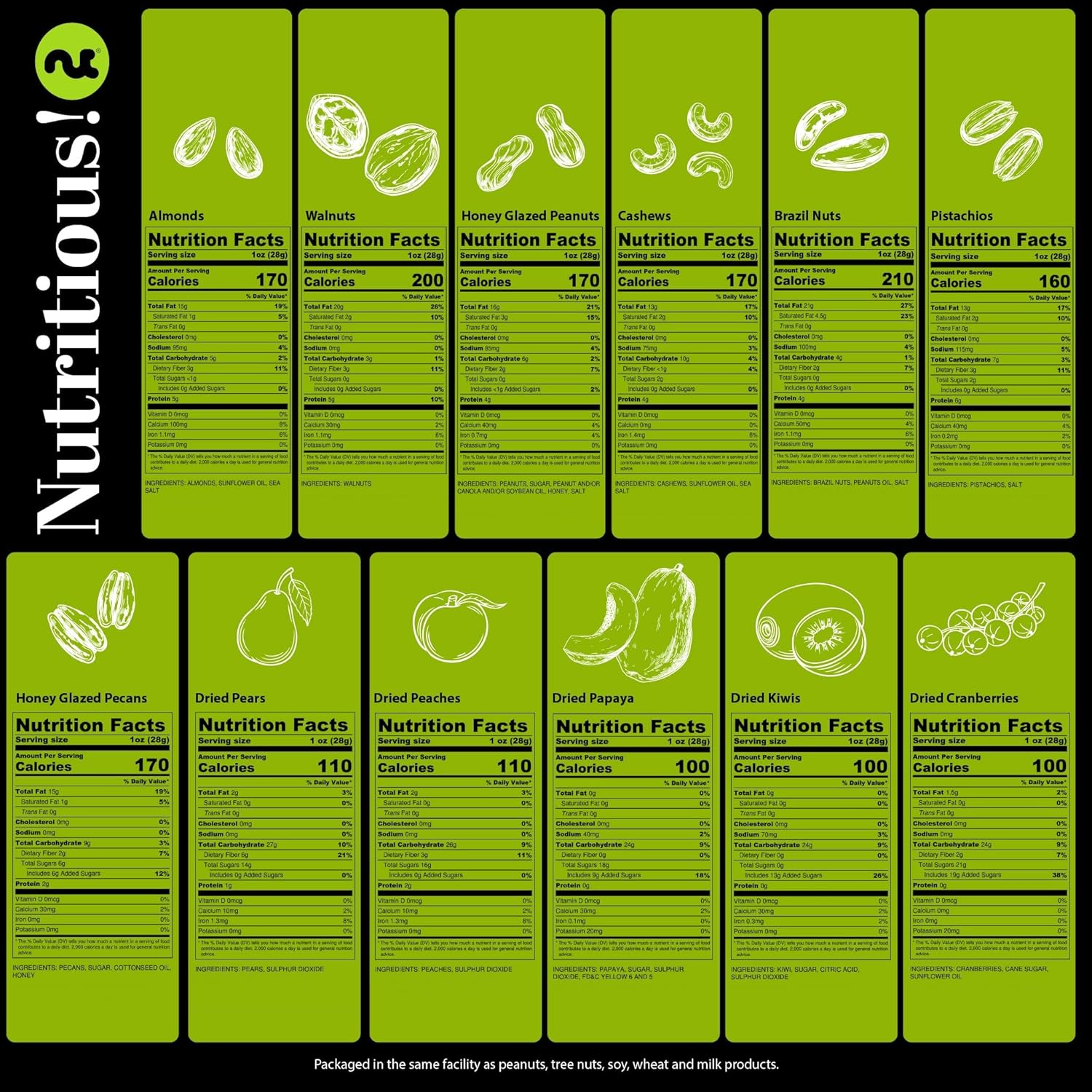 - A SELECTION OF 12 OF OUR BEST NUTS & DRIED FRUITS: Our Red & Gold Hearts Snack Tower includes a handful of each of our 12 signature delicious nuts & dried fruits: Almonds, Walnuts, Cashews, Pistachios, Honey Glazed Pecans, Honey Glazed Peanuts, Brazil Nuts, Dried Cranberries, Dried Kiwis, Dried Papaya, Dried Pears, and Dried Peaches.