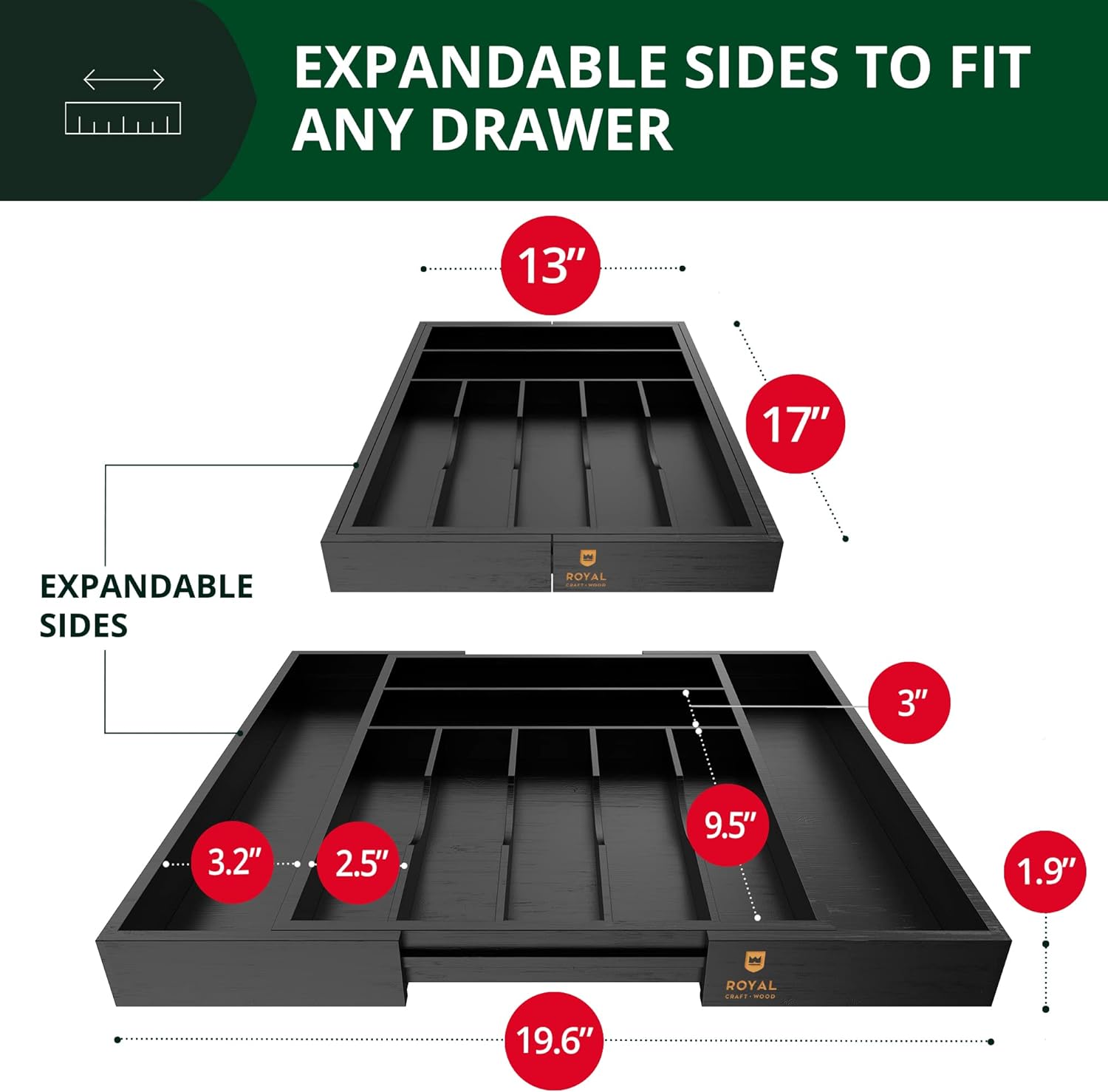 - EXTENDABLE KITCHEN DRAWER ORGANIZER; Royal Craft Wood silverware organizer can be placed in the drawers of all sizes - it is adjustable so that fits like a glove