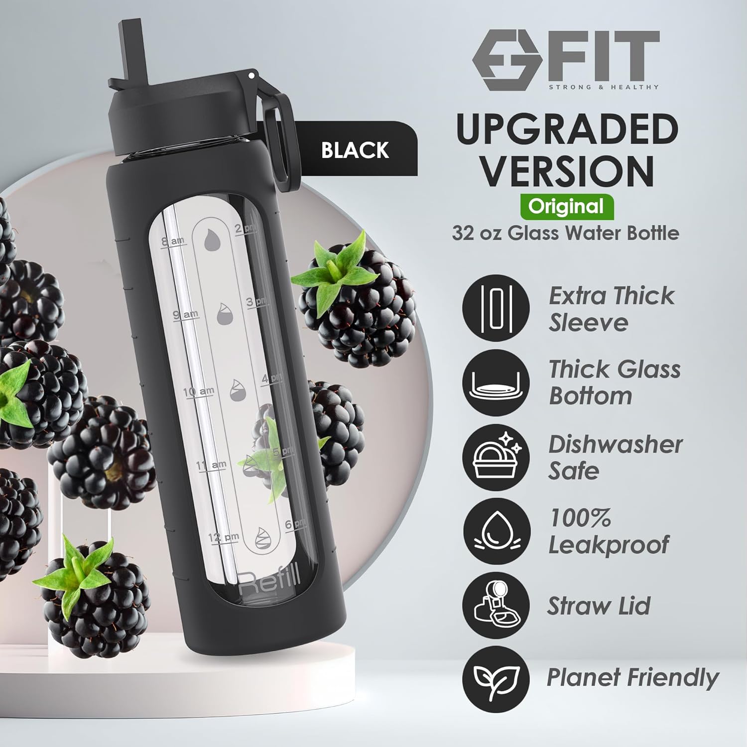 - Stay hydrated all day long: Say goodbye to constant refills; with just one refill in the afternoon, you can effortlessly achieve your daily water intake target; our large glass water bottle features convenient time marks and ml measurements directly printed on the bottle; join the movement to protect the planet by getting rid of single-use plastic bottles; our reusable bottle helps reduce waste while keeping you hydrated in style; it's a positive step for both your health and the environment
