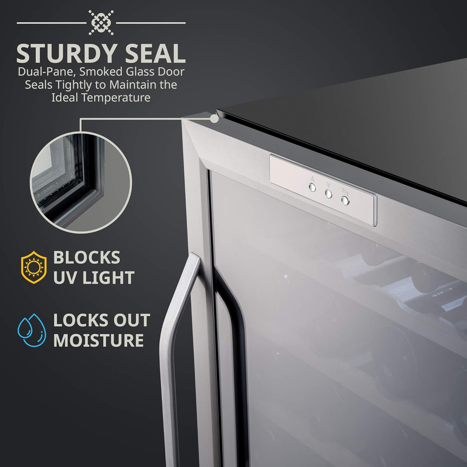 - UV-RESISTANT DOUBLE-PANED THERMOPANE GLASS - A double-paned glass door not only keeps the interior insulated, but also protects your collection from harmful UV light that can damage the tannins and overall flavor of your wine.
