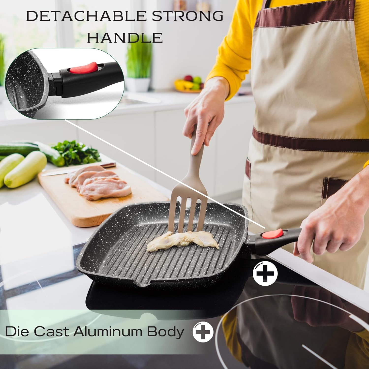 Moss & Stone Square Grill Pan for Indoor Cooking, 11-Inch Nonstick Griddle Skillet with Removable Handle, RV Die-Cast Aluminum Stove Top Grill Pan for Meats & Vegetables, Detachable Handle