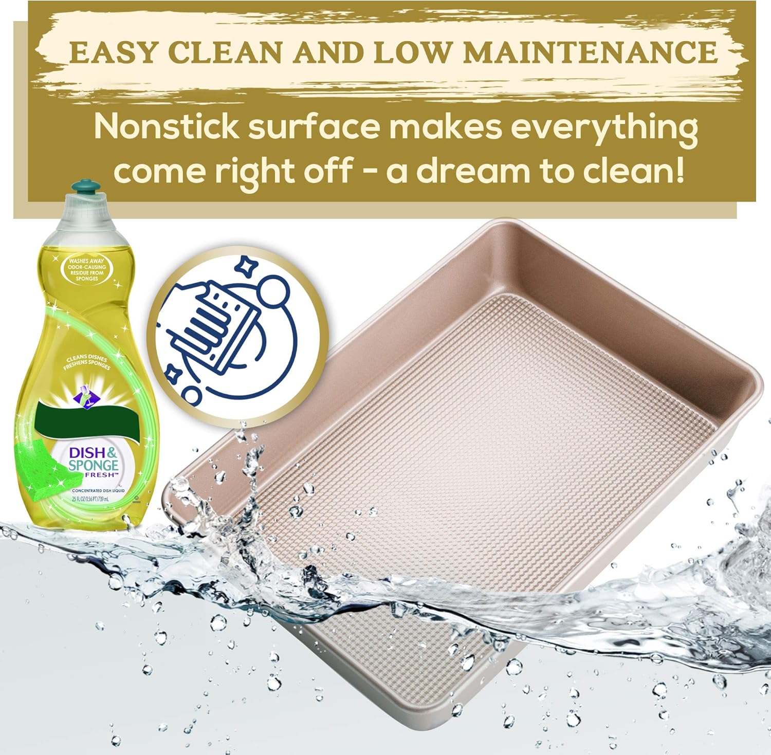 - EASY CAKE RELEASE: No spraying required; there’s nothing worse than having to scrape a perfect cake out of a non-perfect baking pan; your cakes will slide right off this cake pan; this nonstick 9x13 baking pan is coated with a food-safe, PFOA-free, and PTFE-free coating enabling quick and easy cake release