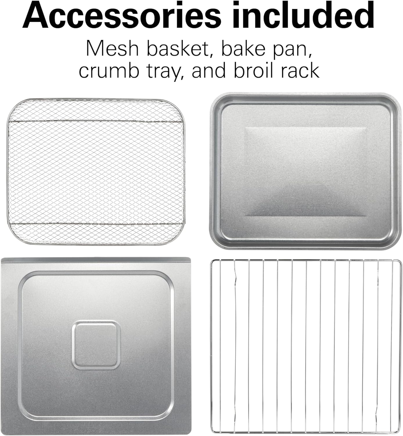 - INCLUDES ACCESSORIES: The air fryer toaster oven has 2 rack positions and includes a metal mesh basket for even air frying, bake pan, and broil rack. The basket fits on the upper oven rack with the bake pan/broil rack below to catch drippings.