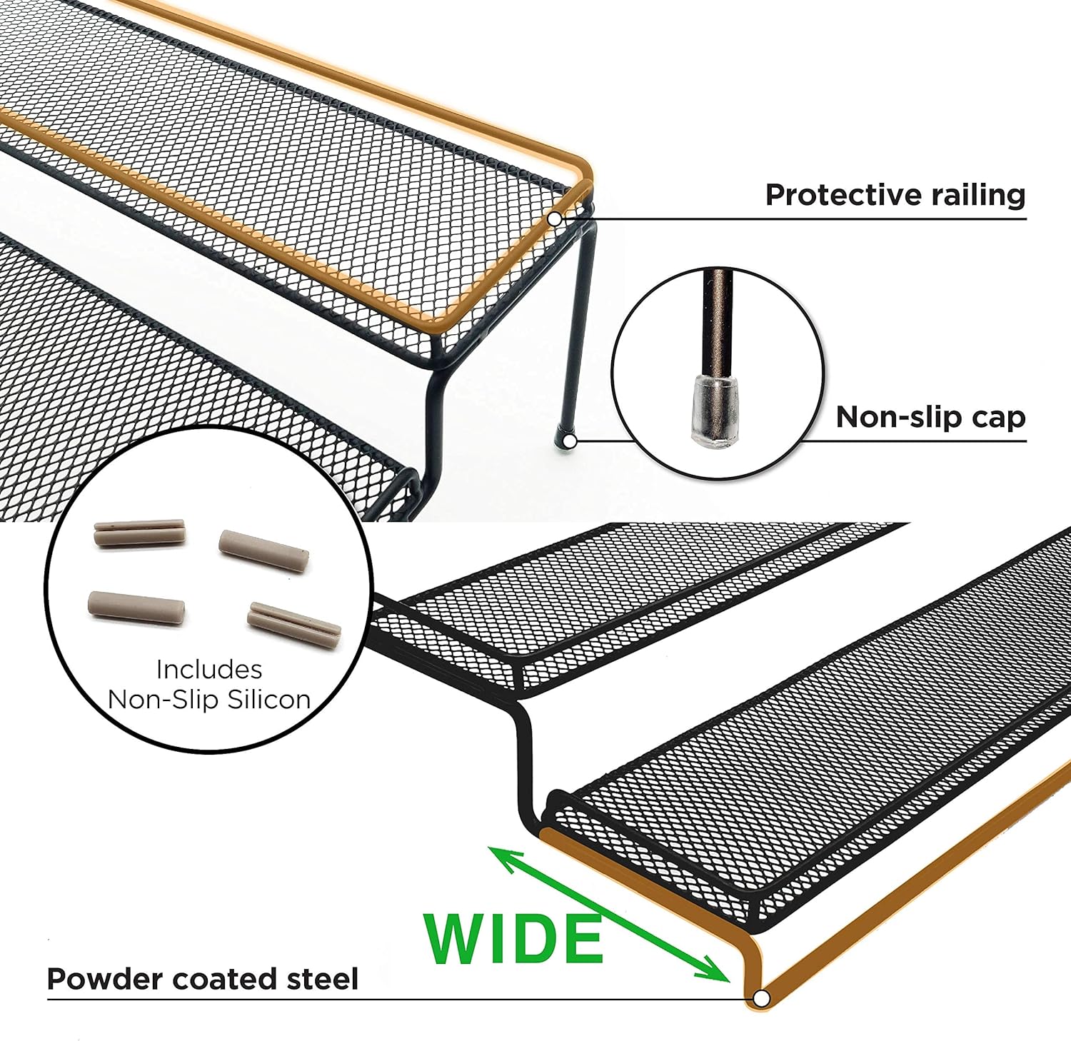 - ⭐️ [Protective Railing & Non-Slip Silicon] ➖ 0.59 inch Protective railing on each step keeps items from slip or fall off ; 4pcs NON-slip silicons prevent it from sliding or scratching surfaces.