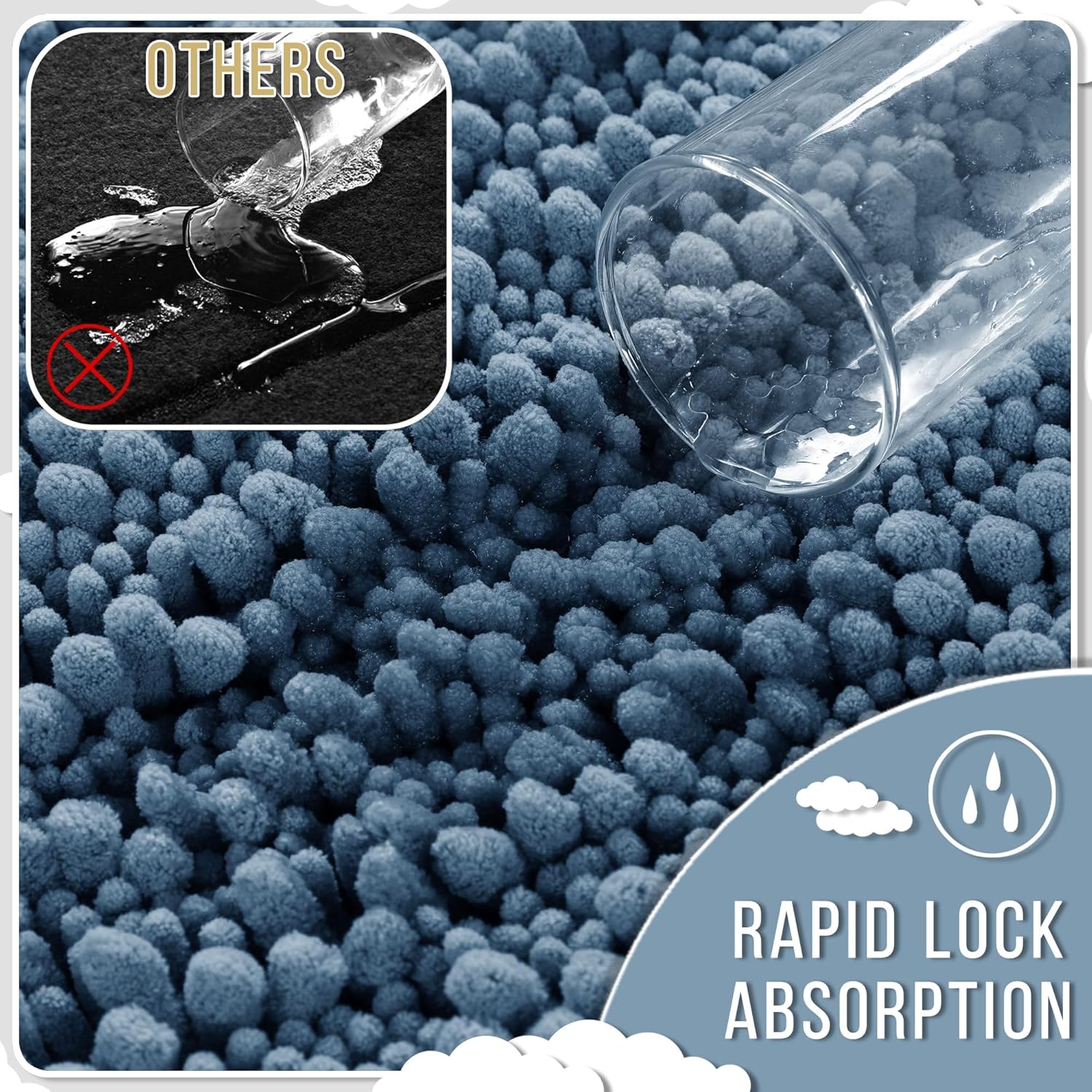 - Massive Water Absorption in Seconds: 5X faster than other materials mats, Yimobra bath mat absorbs 1000ml of water in 3 seconds. The vertical fiber channels lock moisture away from the surface, keeping your bathroom floor dry and discouraging damp environments. Perfect as a shower exit guard or sink splash catcher