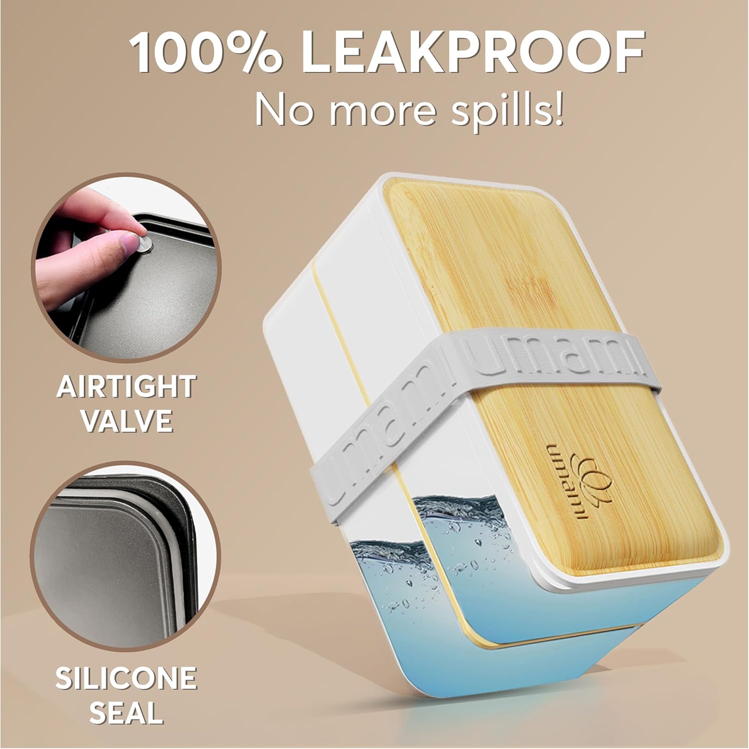 Umami Bento Box Adult All-In-1 w/4 Utensils, 2Sauce Jars, 2 Dividers, 100% Leakproof, Microwave & Dishwasher Safe, Stackable Bento Lunch Box Containers for Men/Women, White & Tan