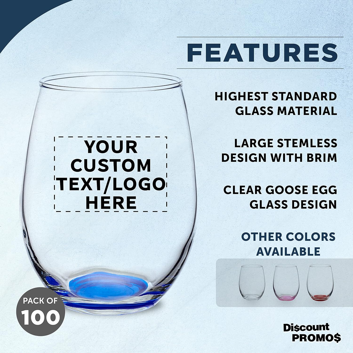 Custom Stemless Wine Glasses in Bulk by ARC Perfection, 15 oz, 100 pack, Personalized Text, Logo, Red or White Wine Glass Set, Blue