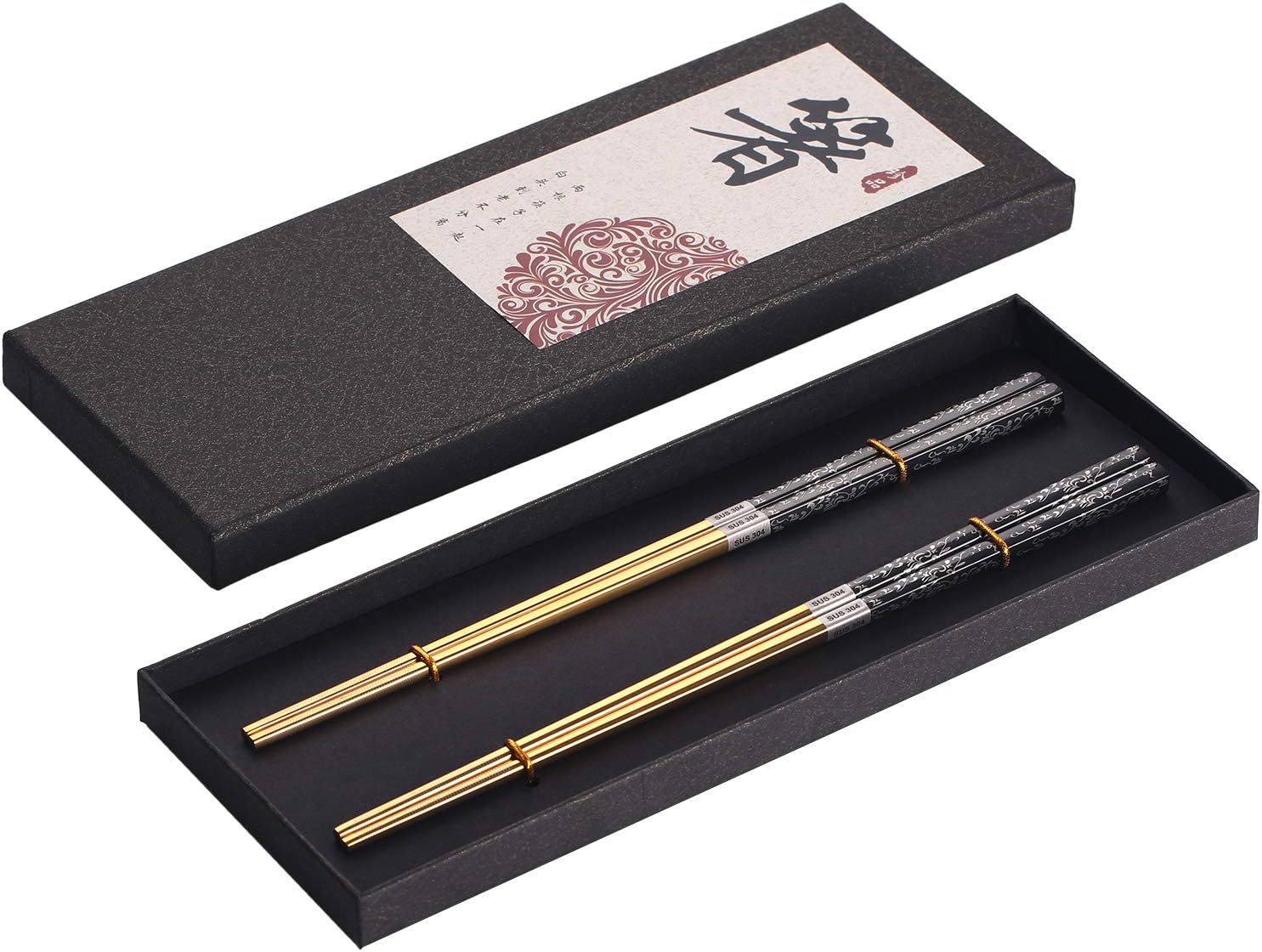 - ✿ 【Best Gift Choice】: The metal chopsticks are with beautiful leaf pattern and black background on chopsticks end. The whole stainless steel chopsticks are titanium plated. The elegant looking and the gift box package make the stainless steel chopsticks very good presentation. Chopsticks mean good cooperation and best friendship. So it is nice gift to friends, lovers, families and cooperates. The reusable chopsticks use longer and the love you present will last longer.