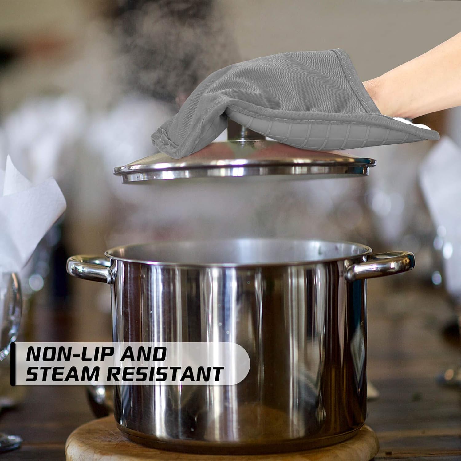 - Improved Control with Non-Slip Grip – We designed our pot holders and oven mitts with a split or divided pocket at the fingertips and a non-slip silicone pattern to give you better flexibility and control when picking up or moving kitchen items.