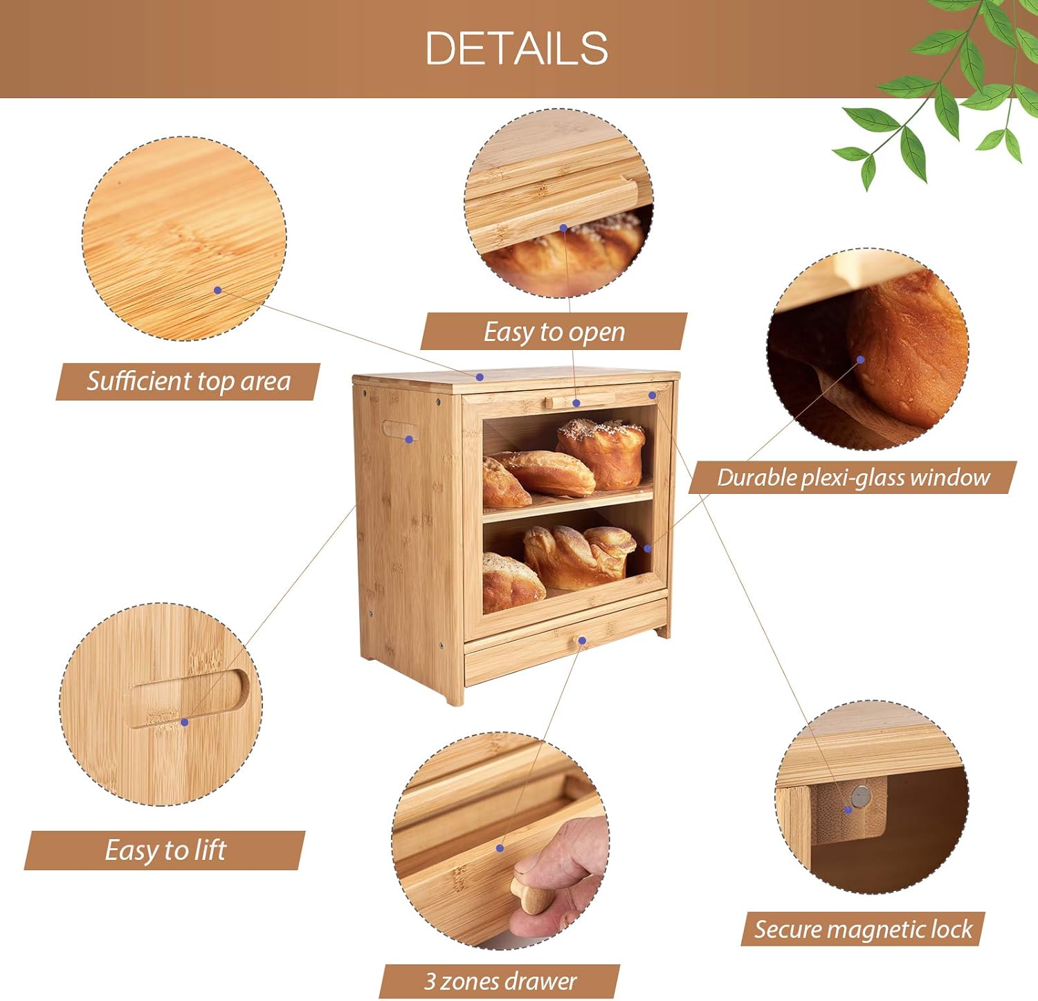 - [KEEP BREAD FRESH]: This high-quality bamboo bread box keeping your bread fresh, crisp, and delicious for longer. Unlike other bread storage containers, it prevents hardening, making it a must-have bread box for kitchen countertops. it prevents hardening and formation, making it a must-have bread box for kitchen countertops.