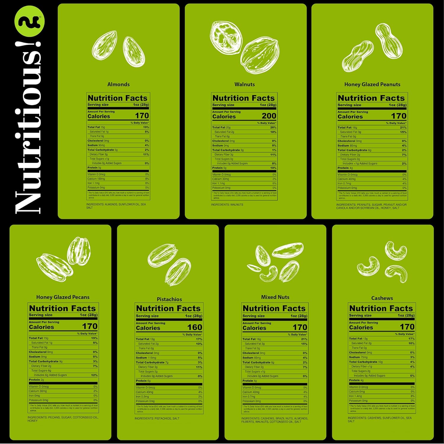 - A SELECTION OF 7 OF OUR BEST NUTS: Our Green and Gold Gift Box includes a handful of each of our 7 signature delicious nuts: Almonds, Walnuts, Honey Glazed Peanuts, Cashews, Honey Glazed Pecans, Pistachios, and Mixed Nuts. All naturally grown and handpicked by our farmers around the world. Weight: 2 Lbs.