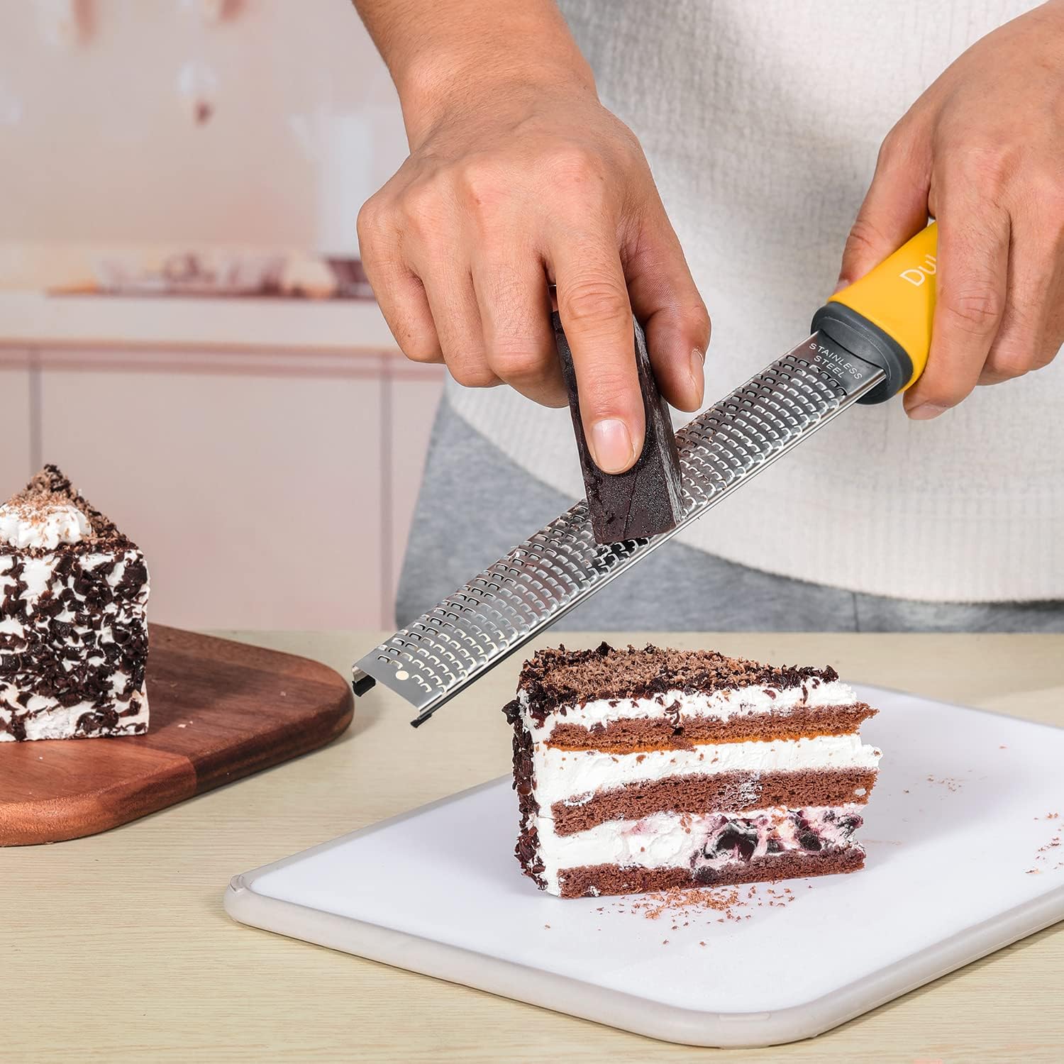 - LEMON GRATER - This zester grater with handle helps you grate cheese, ginger, chocolate, nuts, and more with minimal effort. It enhances the flavor and texture of your dishes without adding extra calories or fat. The handle is non-slip and rubberized for safety and comfort. The blade is sharp and smooth for fast and easy grating.
