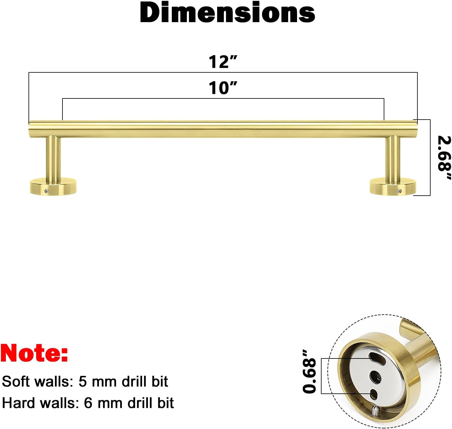 - DIMENSIONS & USE: Overall length is 12" (304mm). The length of hanging space is10" (250mm). 22-Lbs (10kgs) max weight capacity. You can mount this towel bar to either side of your cabinet or closet door for storing at-use hand and dish towels. It can also be used with S hooks, hanging bath balls, hair dryers, tea cups, spoons, clips, etc.