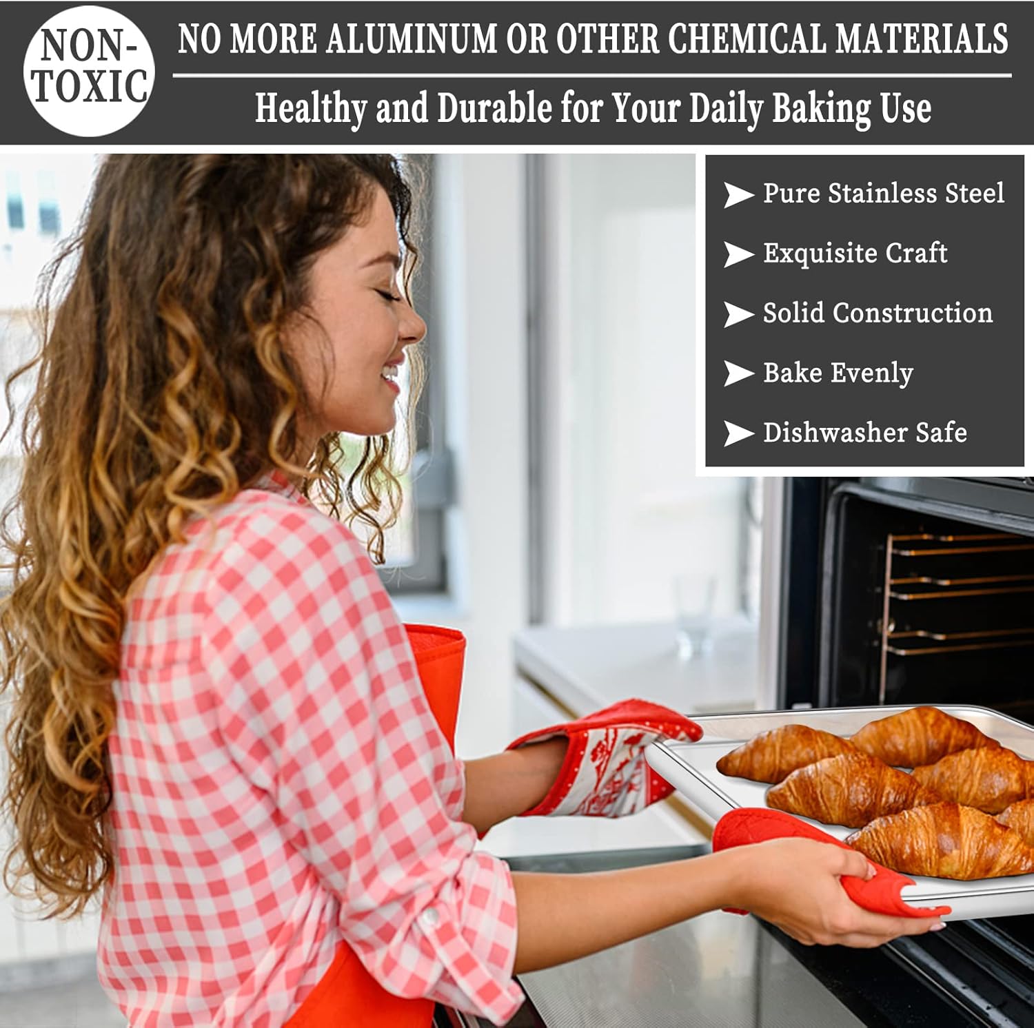- π [ENJOY HEALTHY BAKING] Deedro baking sheets and baking racks are constructed with pure stainless steel without any toxic substance or chemical coating, PTFE, PFOA, BPA and rust free. You needn't worry about coating flaking off or noxious material leaching into your food, great substitution of aluminum pan, healthy and safe for daily use.