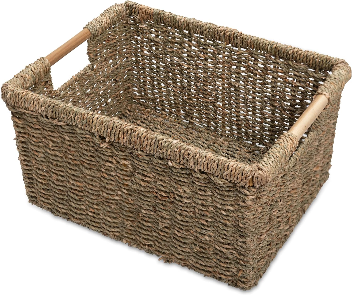 Large Wicker Storage Basket with Wooden Handles, Seagrass Basket for Shelves, Natural Wicker Bin With Handle for Storage 14.5 x 10.3 x 7.5 inches