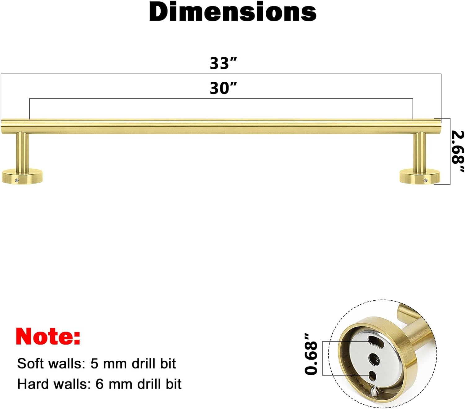 - DIMENSIONS & USE: Overall length is 33" (838mm). The length of hanging space is30" (770mm). 22-Lbs (10kgs) max weight capacity. You can mount this towel bar to either side of your cabinet or closet door for storing at-use hand and dish towels. It can also be used with S hooks, hanging bath balls, hair dryers, tea cups, spoons, clips, etc.