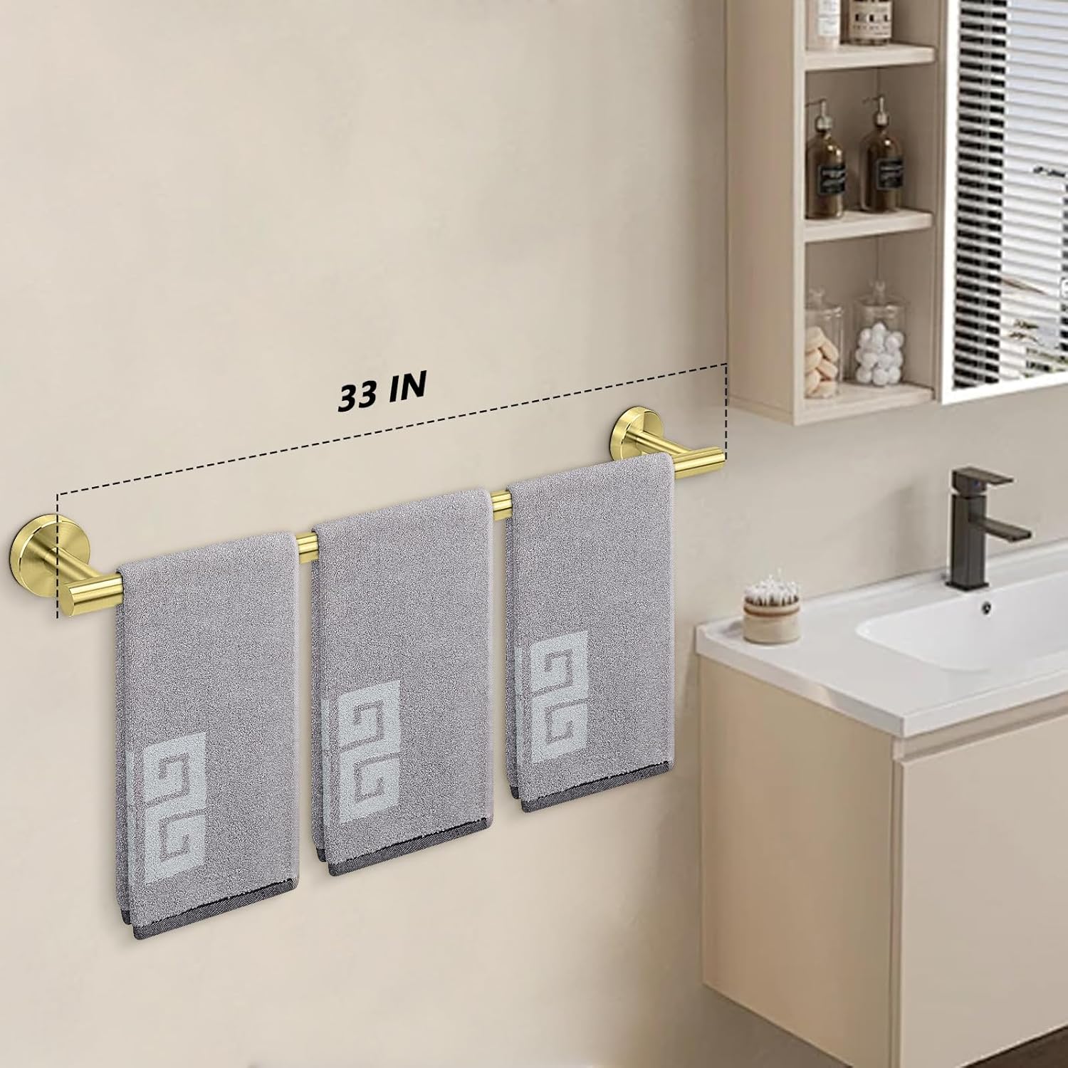 NearMoon Bath Towel Bar, Bath Accessories Thicken Stainless Steel Shower Towel Rack for Bathroom, Towel Holder Wall Mounted (1 Pack, Brushed Gold, 33 Inch)