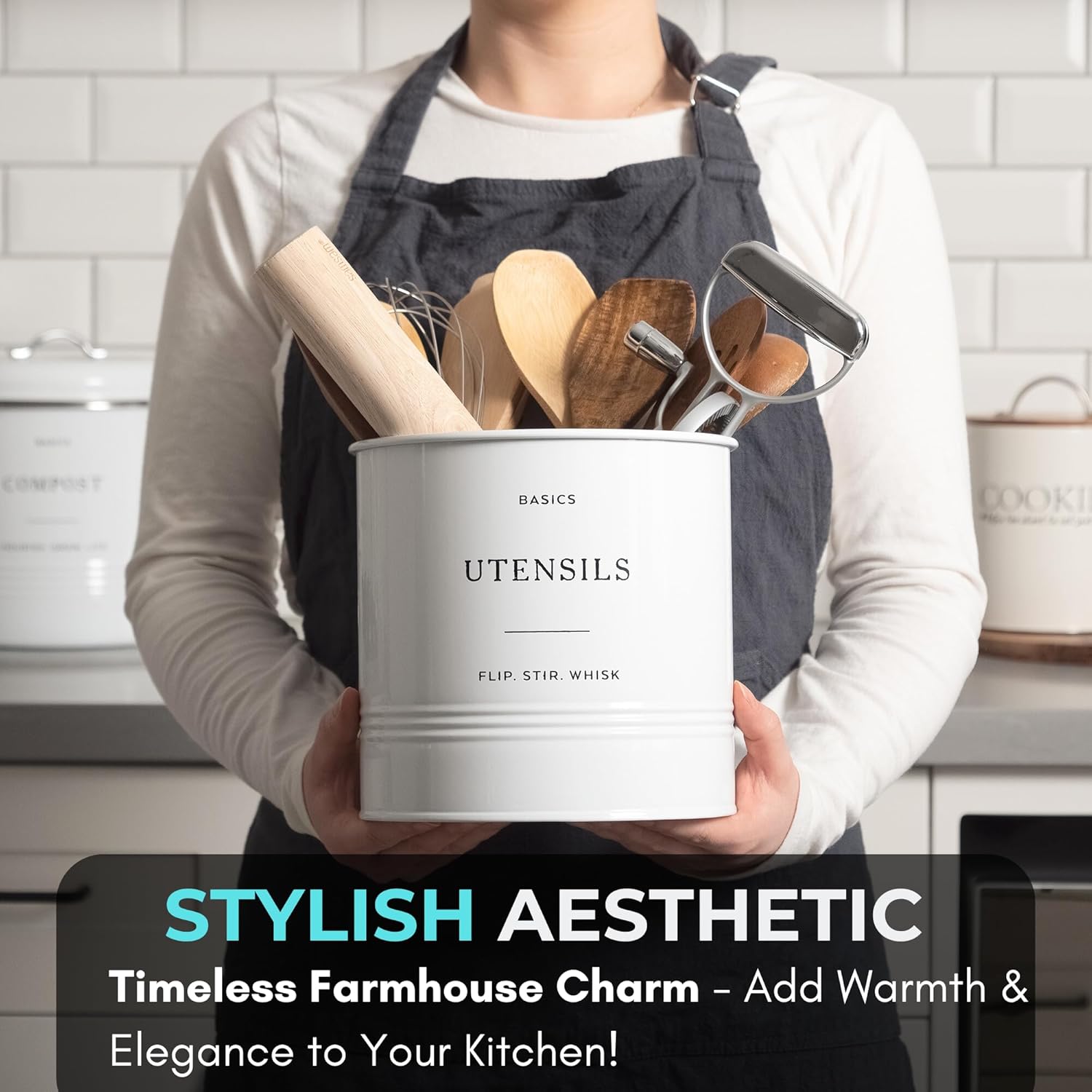 D'Lifeful Kitchen Utensil Holder for Countertop - 7" x 7" Large Utensil Holder for Kitchen Counter - Farmhouse Spatula & Cooking Tools Organizer - White Metal Crock for Modern Aesthetics