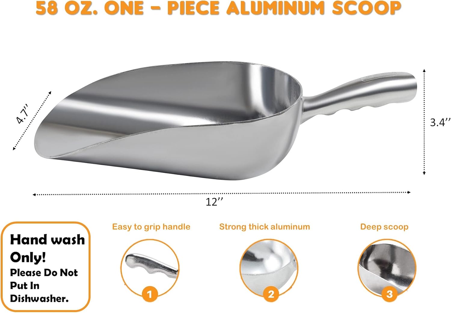 - SMOOTH SURFACES FOR EASY CLEANING - the scoop is made of durable food-grade aluminum hand wash only please do not put in dishwasher!