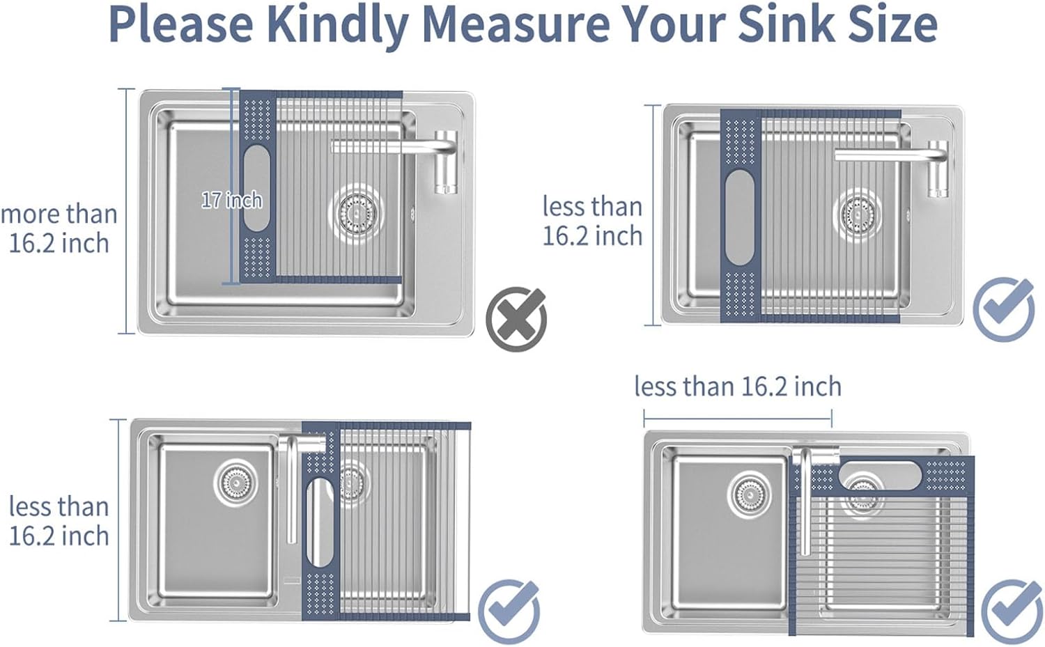 - OVER THE SINK DRYING RACK : This one is 17(L) x 15(W) inch, Recommended sink size: SHORTER than 16 inches. To Avoid Buying Inappropriate Size of this Drainer Rack, Please Firstly Measure the Size of Your Sink Before Purchasing. (NOTE: Only Drying Rack not including the silverware or dishes.)