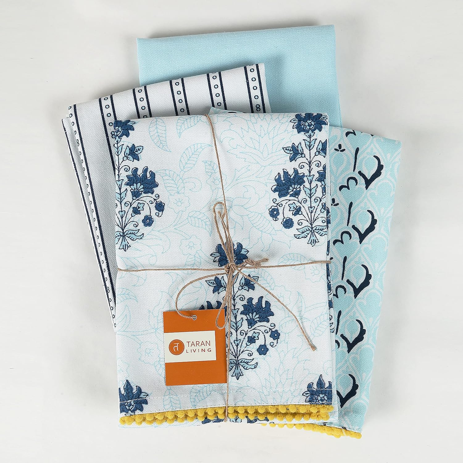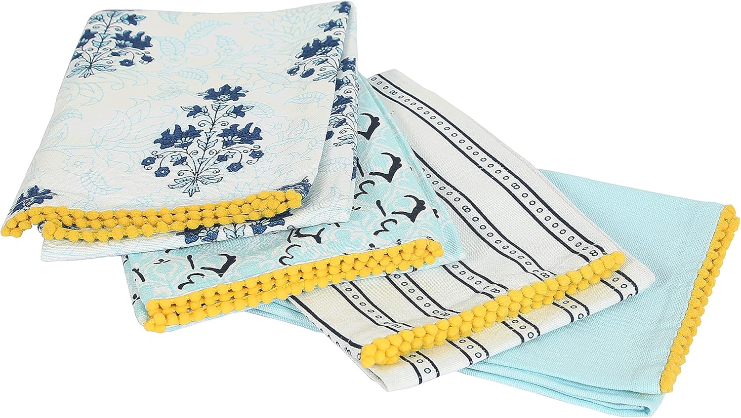 - PACKAGE CONTENT & SIZE : The durable cotton cloth measures approx 18"x28" set of 4 printed kitchen & table linens Cloth Napkins Set of 4 includes: 3 All Overall hand printed Dish towel and a complimentory Printed Dish towel. so you’ll always have plenty on hand. Lint free quick dry comes with hanging loops and no color fade after multiple wash Its perfect for everyday use.