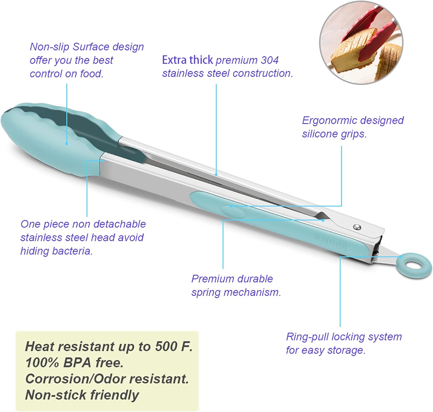 4 Pack Aqua Sky Kitchen Tongs, Premium Silicone BPA Free Non-Stick Stainless Steel BBQ Cooking Grilling Locking Food Tongs, 9-Inch & 12-Inch