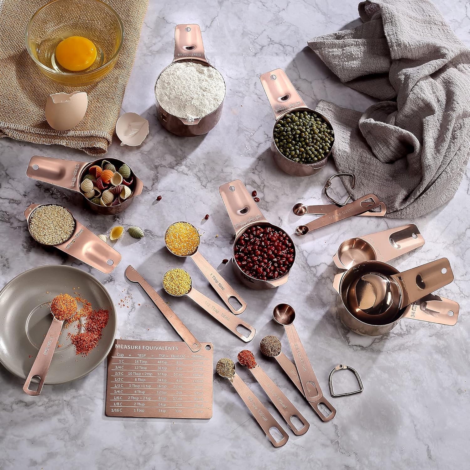 - 19 PCS Stainless Steel Measuring Cups and Spoons Set Included: 8 Measuring Cups (1/16 cup, 1/8 cup, 1/4 cup, 1/3 cup, 1/2 cup, 2/3 cup, 3/4 cup, 1 cup), 9 Measuring Spoons (1/16 tsp, 1/8 tsp, 1/4 tsp, 1/3 tsp, 1/2 tsp, 3/4 tsp, 1 tsp, 1/2 tbsp, 1 tbsp), 1 Leveler & 1 Measurement Conversion Chart Fridge Magnet. Whatever Measurement You Need, We Got You Covered.