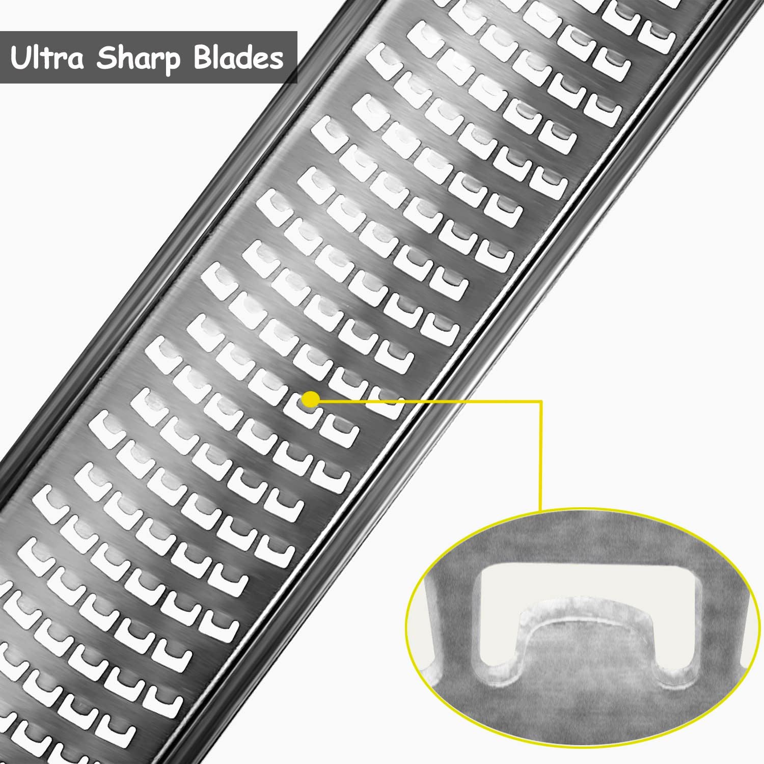 - EFFORTLESS & SAFE - The blade of this cheese grater is designed with special square blade and processed with photo-etching technology. Tough body with large size no-slip makes it more safe and effortless while grating. It is the better choice of grater and zester for kitchen tools