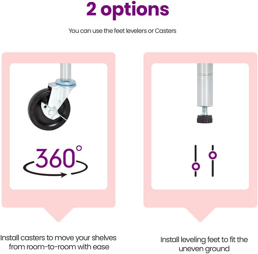 - ✔【Strong Weight Capacity】Without wheels, the weight limit for each shelf is 350 pounds and the total weight limit for the entire shelf is 2,100 pounds.When wheels are mounted, the weight limit for each shelf is 85 pounds and the total weight limit for the entire shelf is 510 pounds.