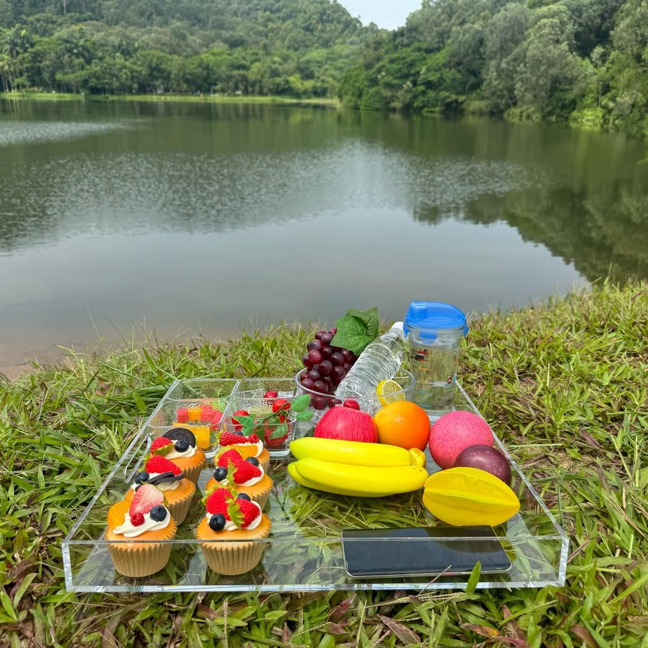 Clear extra large Ottoman Tray with Handles 18"x18"x2" Spill proof Acrylic Serving Tray Organizer Tray Decorative safe edge tray For Living Room Entryway Bedroom Kitchen Coffee Table coutertop