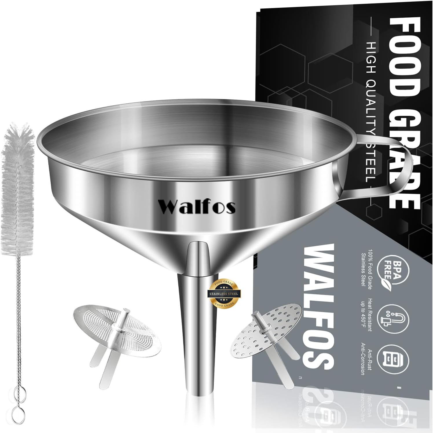 - EASY TO USE & CLEAN - Stainless steel funnel has a side handle to conveniently hold the funnel over a jar, pot or pan. With convenient loop on the side, you can put it in kitchen cabinets, hang in garages, stored in utility rooms or anywhere you can put it. Easy to clean by simply washing with soapy water after use. It is also dishwasher safe (WALFOS RECOMMEND:Please clean and dry in time after use)