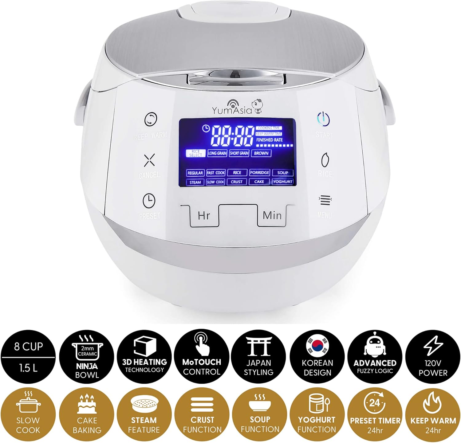 Yum Asia Sakura Rice Cooker with Ceramic Bowl and Advanced Fuzzy Logic (8 Cup, 1.5 Litre) 6 Rice Cook Functions, 6 Multicook Functions, Motouch LED Display, 120V Power (White and Siver)