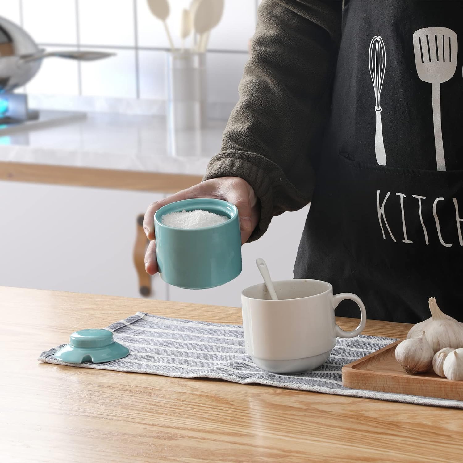 - HUMANIZED DESIGN : The size is 8oz,3.5"Lx3.5"Wx3.2"H,suitable for daily use.This sugar bowl with a small cutout on the lid can accommodate small spoons which is more convenient to use